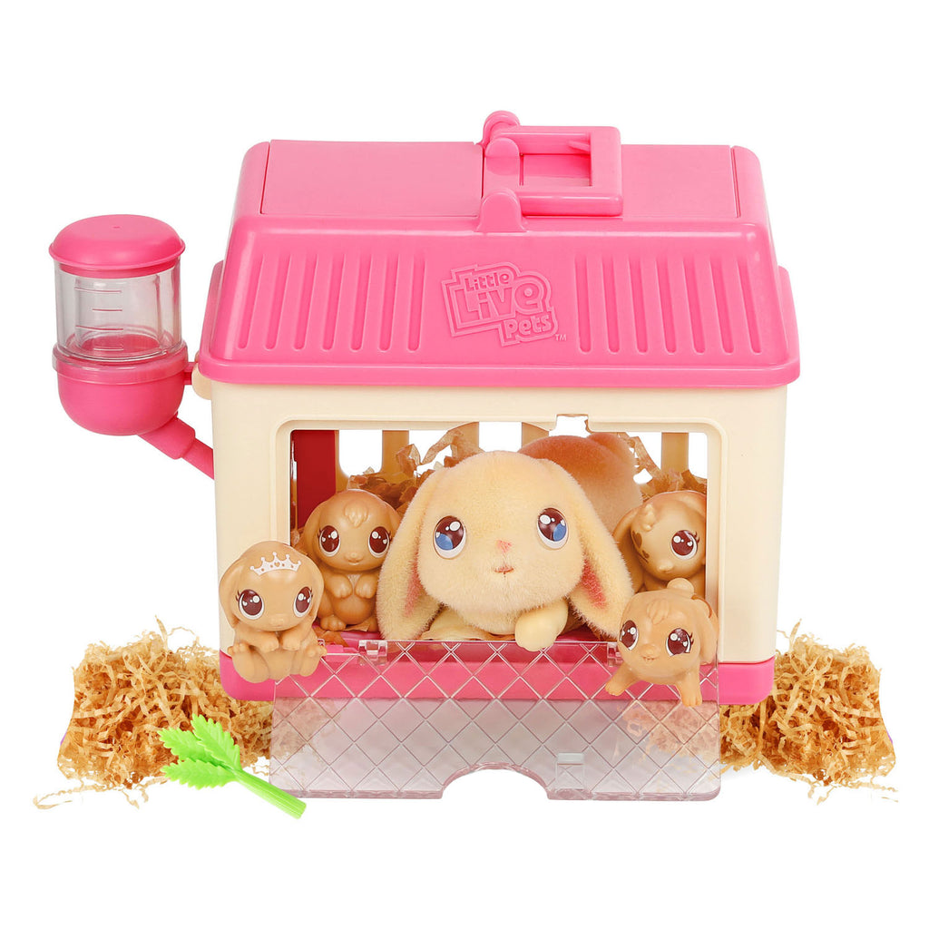 Hoe schattig is dit kleine konijntje in haar roze minihokje! En weet je wat? Dit konijntje wordt mama... Maar wanneer? Verzorg mama goed en voed haar met de selderij en haar oogjes zullen sluiten. Zet haar dan op het stro in haar hokje en sluit de deur. Vul de waterfles en kijk hoe het water verdwijnt! Ze is klaar om op magische wijze 2, 3 of 4 baby's te krijgen! Er zijn maximaal 4 schattige babykonijntjes te ontdekken in verschillende poses. Ze worden zelfs geleverd met verrassende accessoires die de baby's kunnen dragen: een strik of een slabbetje. Vergeet je niet de geboorteakte in te vullen?Deze magische ervaring is steeds opnieuw te herhalen, zodat kinderen de verrassing en vreugde kunnen ervaren van het zorgen voor mama en het ontdekken van haar baby's.
