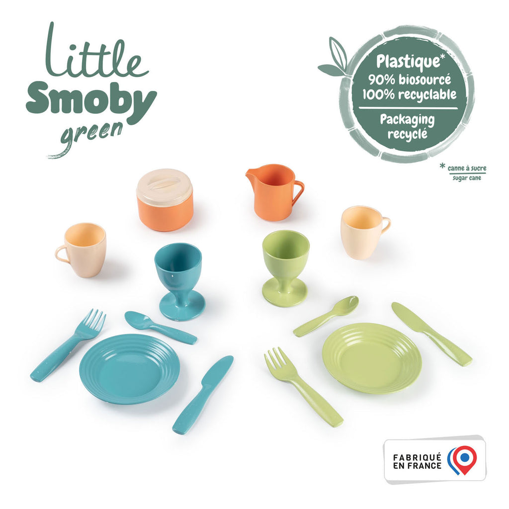 Theeset van Smoby, 14 delig. Bestaande uit: 2 bekers, 2 theekopjes, 2 borden, 2 vorken, 2 messen, 2 lepels, 1 melkkannetje, 1 suikerpotje. Gemaakt van plantaardig plastic. Verpakking van gerecycled materiaal. Geschikt voor kinderen vanaf 18 maanden.