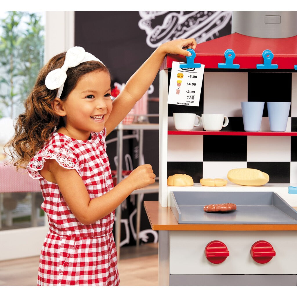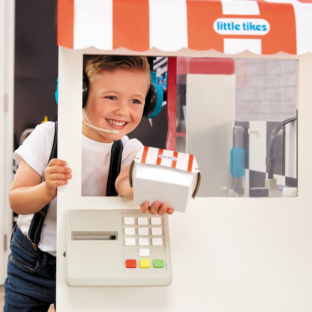 Bestellen maar! Het Little Tikes drive-in restaurant van echt hout is de perfecte plek om heel veel gerechten te bereiden en spannend te spelen. Je kunt de grill bijna ruiken met dit realistisch uitziende, robuuste en duurzame drive-in restaurant, waar kinderen urenlang een rollenspel kunnen spelen. Deze speelset is geïnspireerd op de drive-in cafés en -restaurants waar we allemaal graag naartoe gaan voor ons favoriete gerecht. Door de speelmogelijkheden aan twee kanten kunnen kinderen doen alsof ze iets op de grill bakken, een bestelling opnemen of klant zijn. Kinderen krijgen het recept om hun verbeelding en creativiteit te gebruiken dankzij de meer dan 40 inbegrepen en interactieve accessoires, zoals hamburgerschijven, broodjes, bekers, borden, keukengerei en meer.