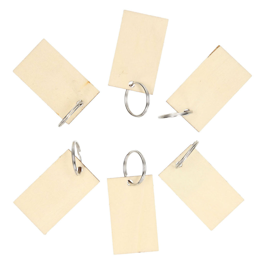 Set van 6 houten sleutelhangers om zelf te versieren. Elke sleutelhanger is 5 x 3 centimeter groot en heeft een metalen sleutelring. Geschikt vanaf 3 jaar.