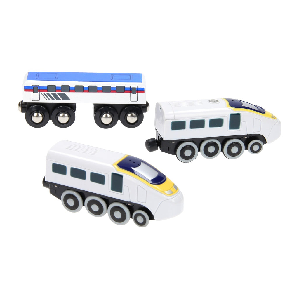 Locomotief met afstandsbediening. Laat de trein 2 kanten op rijden, stoppen of maak verschillende geluiden zoals het omroepen van een conducteur, claxongeluiden of het opengaan van een slagboom. Deze met batterijen aangedreven trein kan automatisch over het (houten) spoor rijden. De locomotief is geschikt voor verschillende houten treinbanen, zoals Eichhorn, Brio en BigJigs.