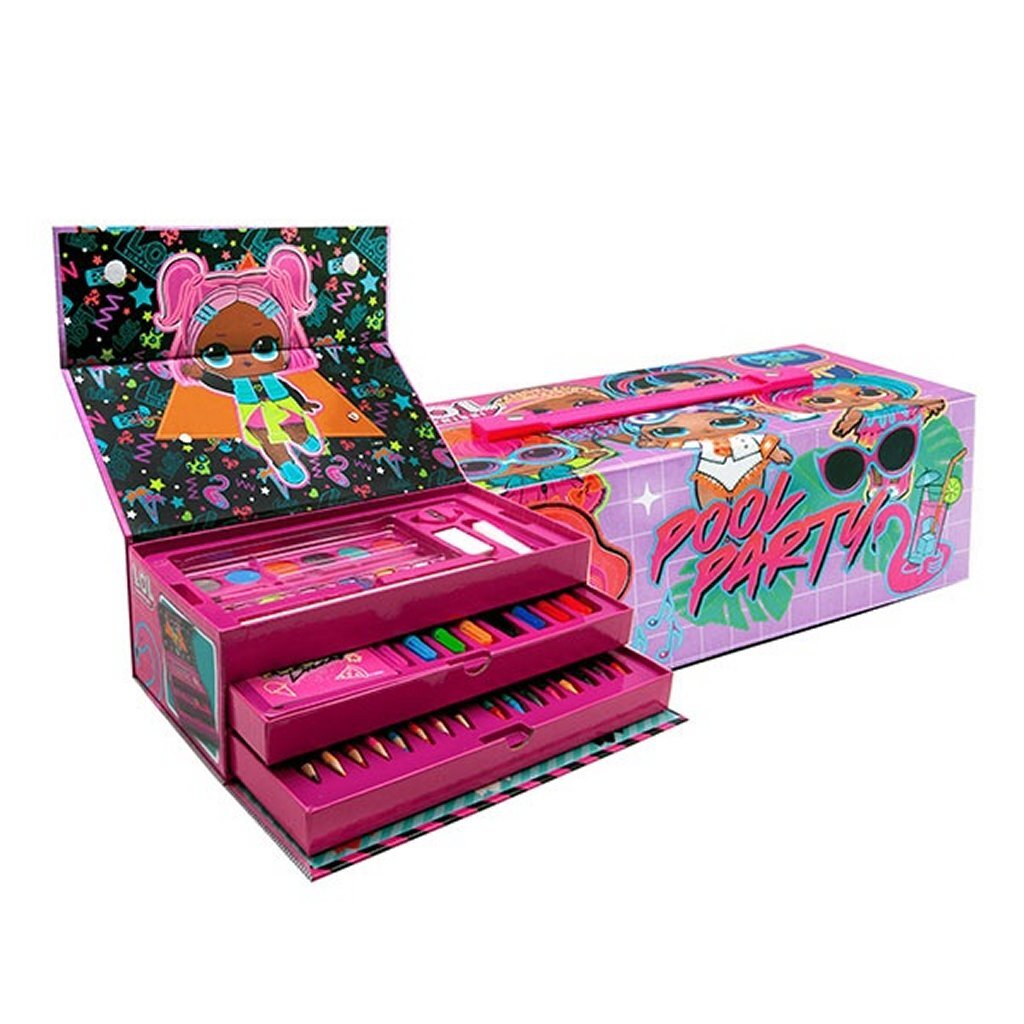 Mooie 42-delige kleurkoffer met LOL Surpise Pool Party opdruk. Een waanzinnig creatieve kleurkoffer waarin alles mooi isingedeeld in drie lagen, waaronder 2 laden.