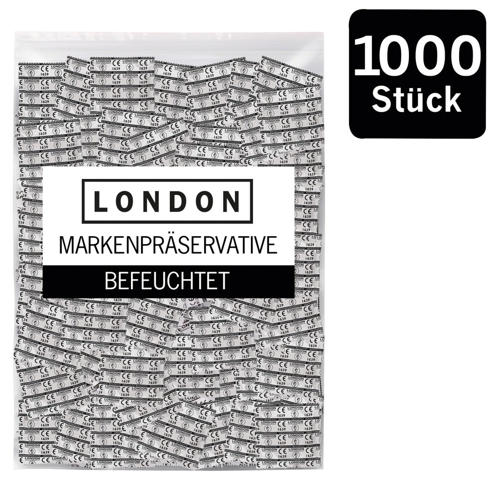 1.000 transparante condooms van het merk LONDON met vochtinbrengende coating en reservoir op siliconenbasis. Individueel in krimpfolie verpakt (6 x 6 cm) en losjes verpakt in een zakje.