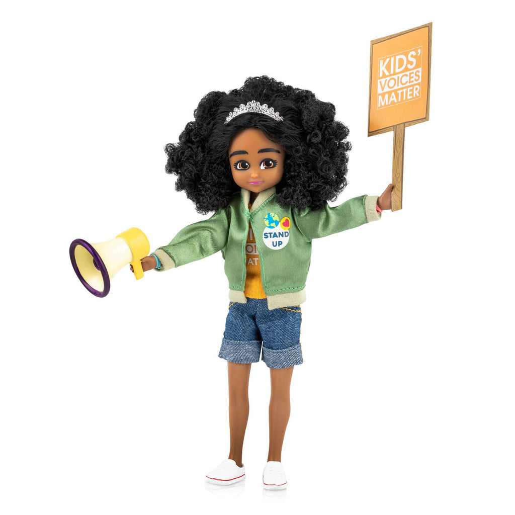 Ga met jouw Lottie pop op pad en zet je in voor het goede doel! Jouw Lottie pop heeft haar spandoek bij zich, compleet met megafoon, zodat iedereen kan horen wat ze er van vindt!