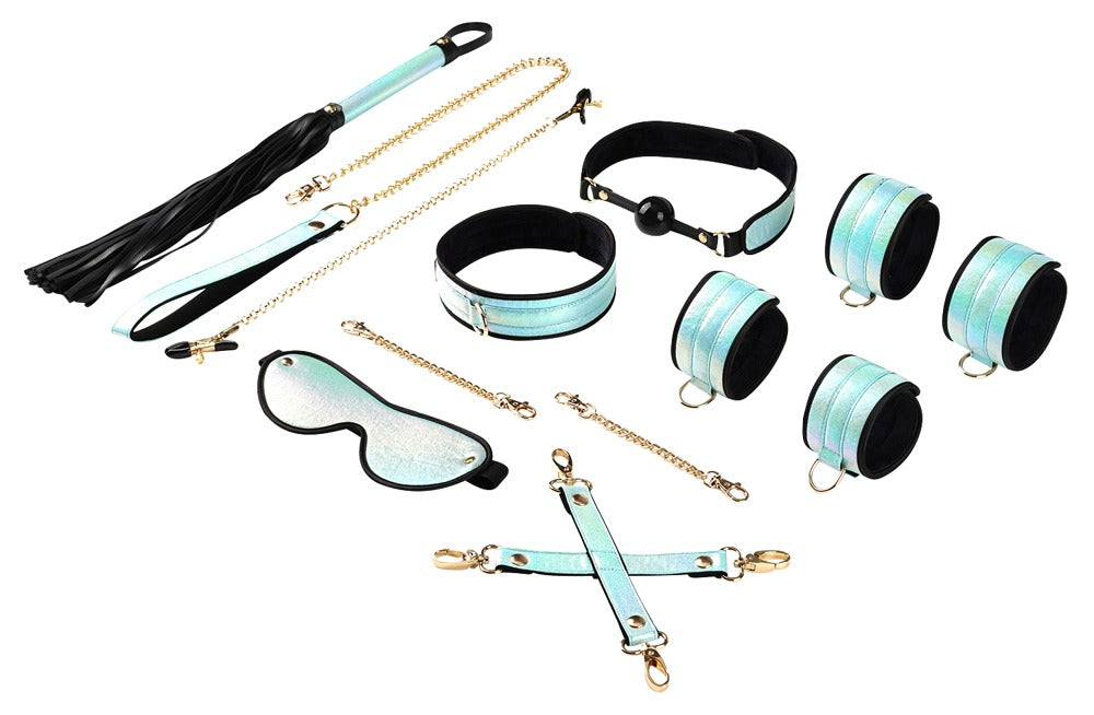 8-delige bondageset Vivid Sorairo van Liebe Seele in een elegante blauwe parelmoer-look (Glossy Sky) met goudkleurige fittingen en accessoires. Een heel speciale set voor nieuwsgierigen en kenners - exclusief en van de hoogste kwaliteit! Deze set bevat:
