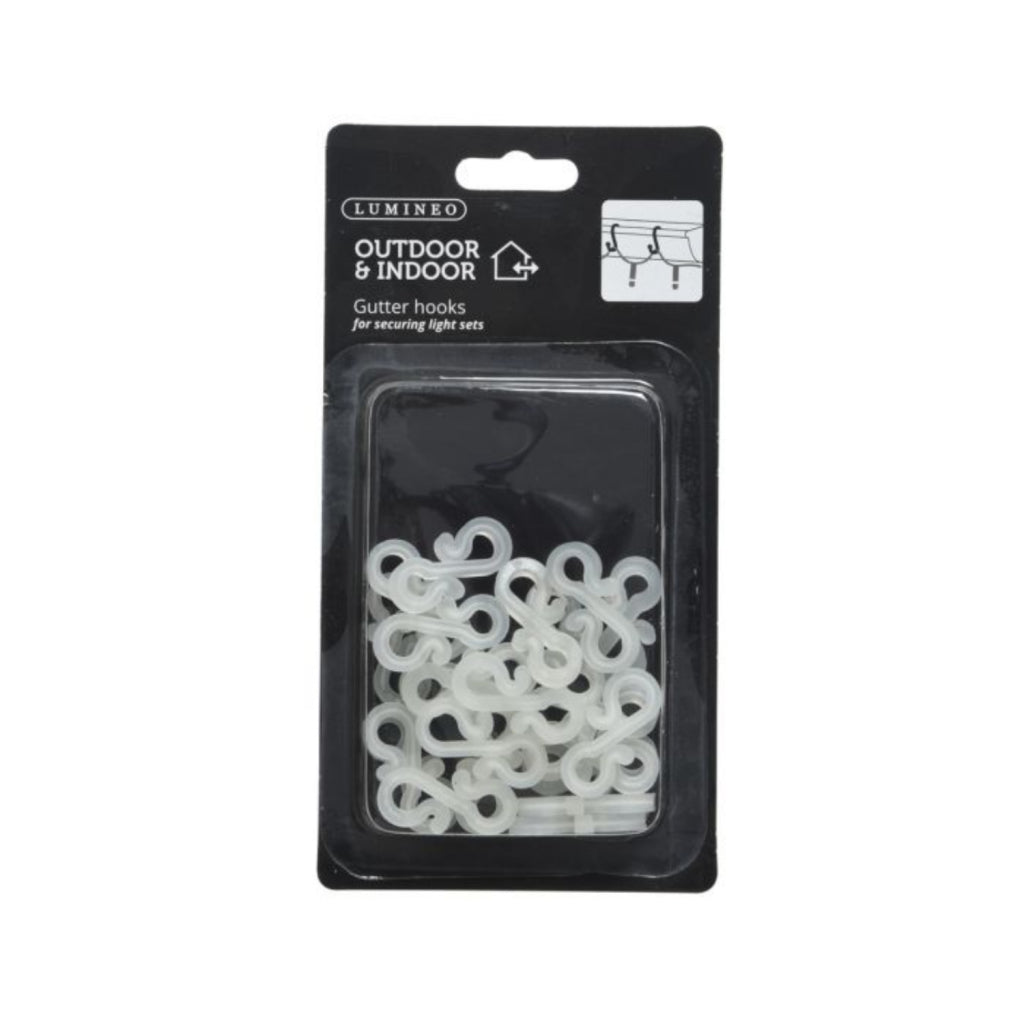 24 kunststof dakgoothaakjes voor het ophangen van kerstverlichting, lichtketting, ijsgordijn etc aan de dakgoot. Hoogwaardige kwaliteit. Geschikt voor binnen en buiten. Afmeting haakje ca. 3,5 cm hoog en 1,8 cm breed. Makkelijk te bevestigen.