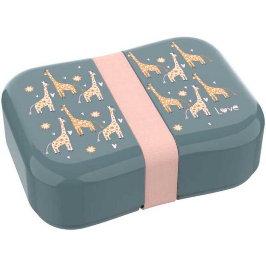 Broodtrommel Lunch Buddies Giraf is een blauw broodtrommel met afbeeldingen van giraffes, bloemetjes en hartjes. Dankzij het roze elastiek blijft de broodtrommel gesloten. Geschikt voor kinderen vanaf 3 jaar.