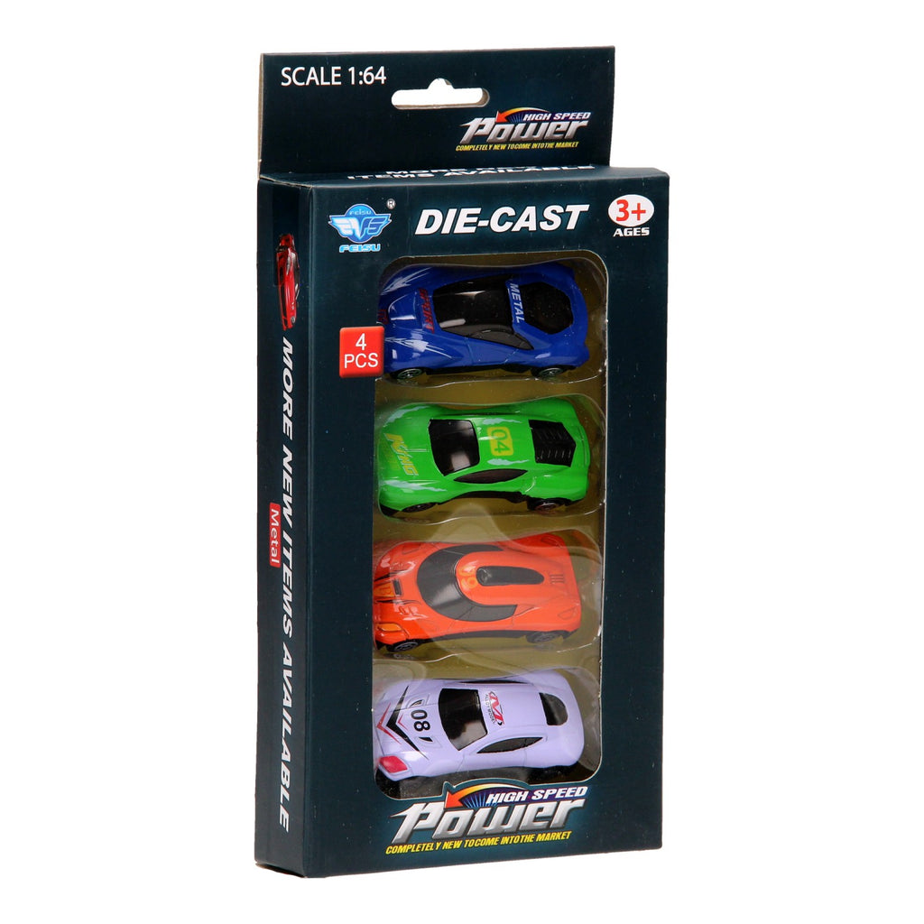 In dit setje zitten vier snelle metalen auto's in verschillende kleuren. Welke van de vier is het snelste denk je? De lengte van de auto's is 6 centimeter.