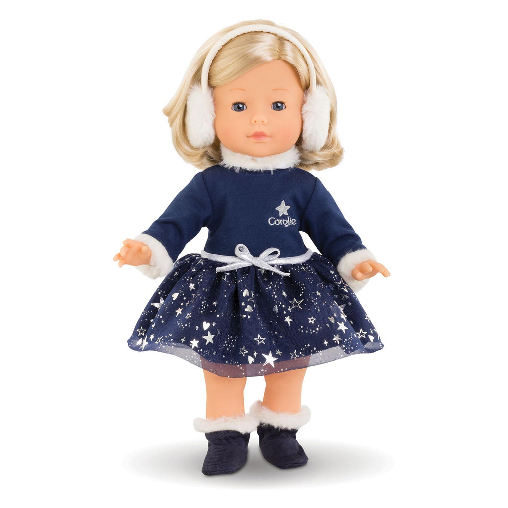 Corolle babypop Priscille. De pop is 36 centimeter groot, heeft lang blond haar en blauwe ogen. Ze draagt een donkerblauw jurkje met wit en zilveren details, oorwarmers en schoentjes.