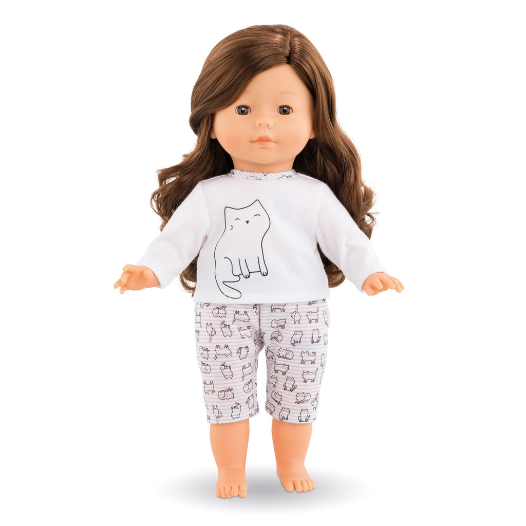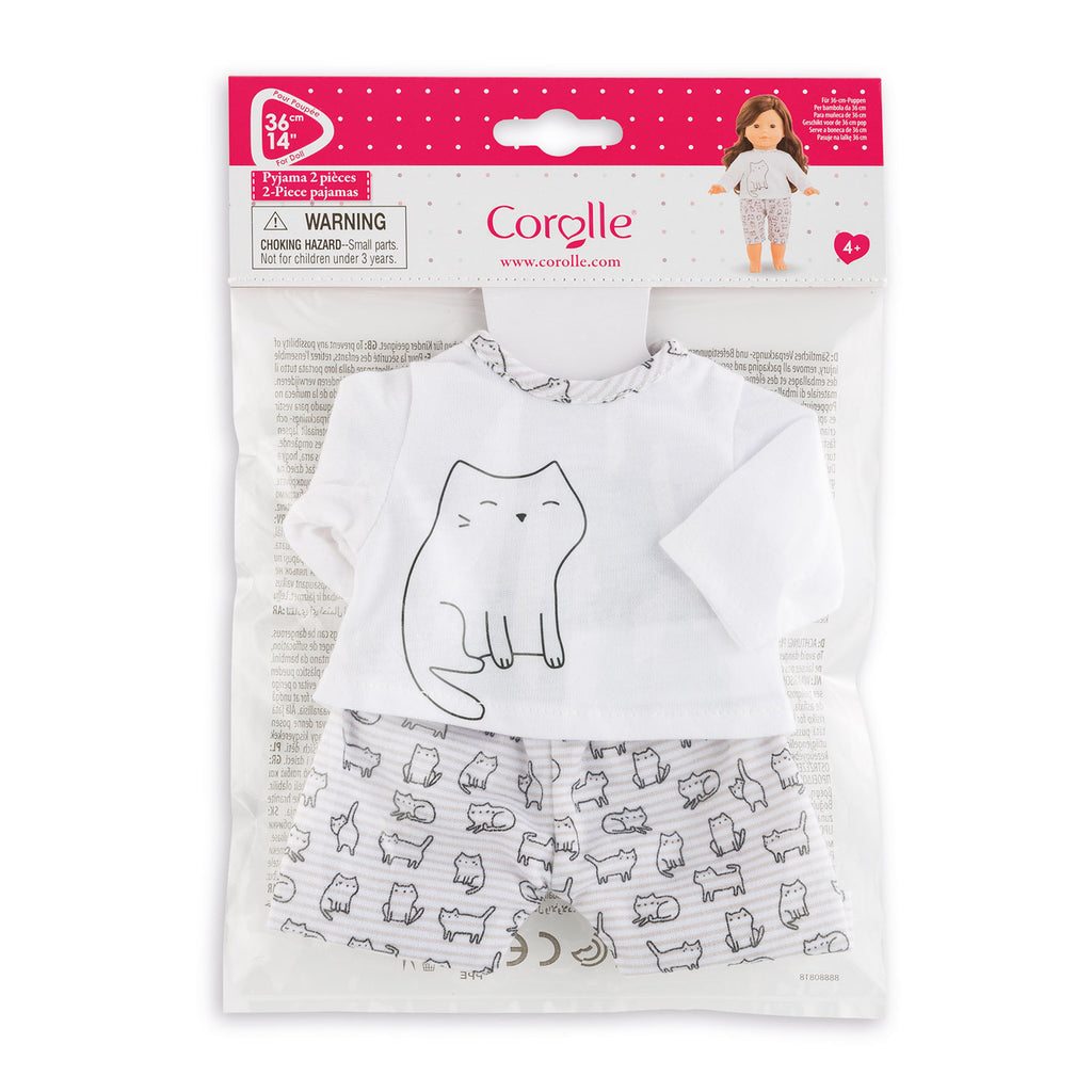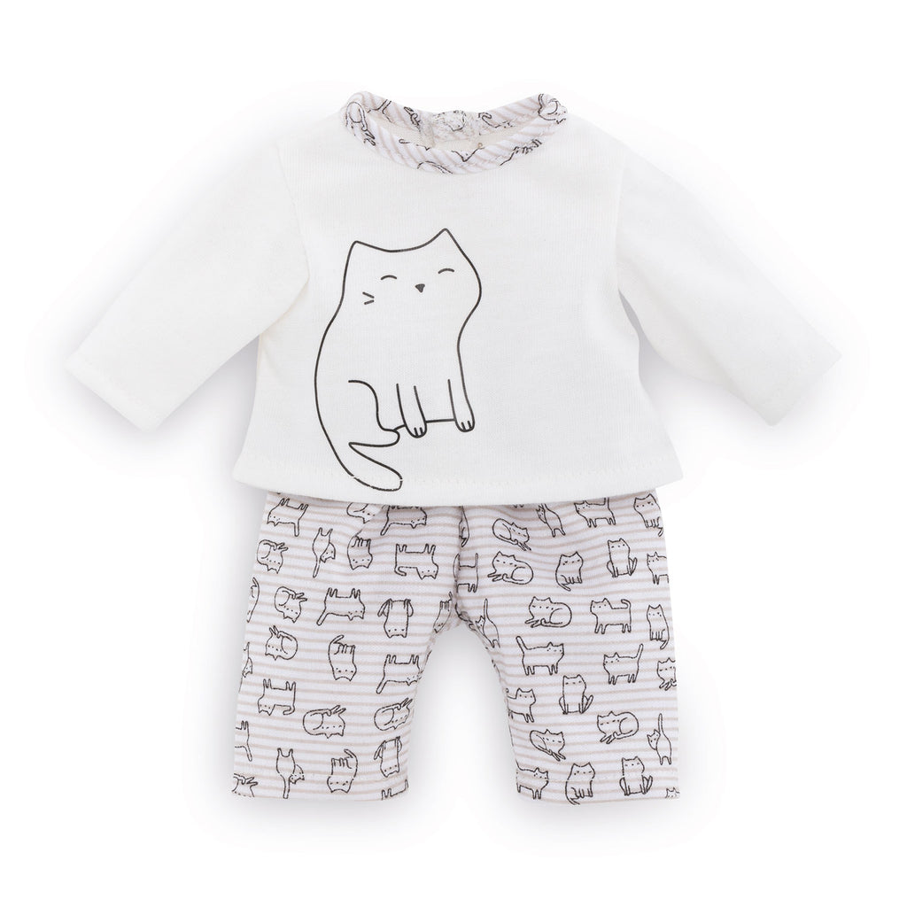 De pyjama heeft een wit shirt met een grijs boordje waar een kat op staat en een grijze broek met kattenpatroon. Geschikt voor Corolle poppen van 36 centimeter.