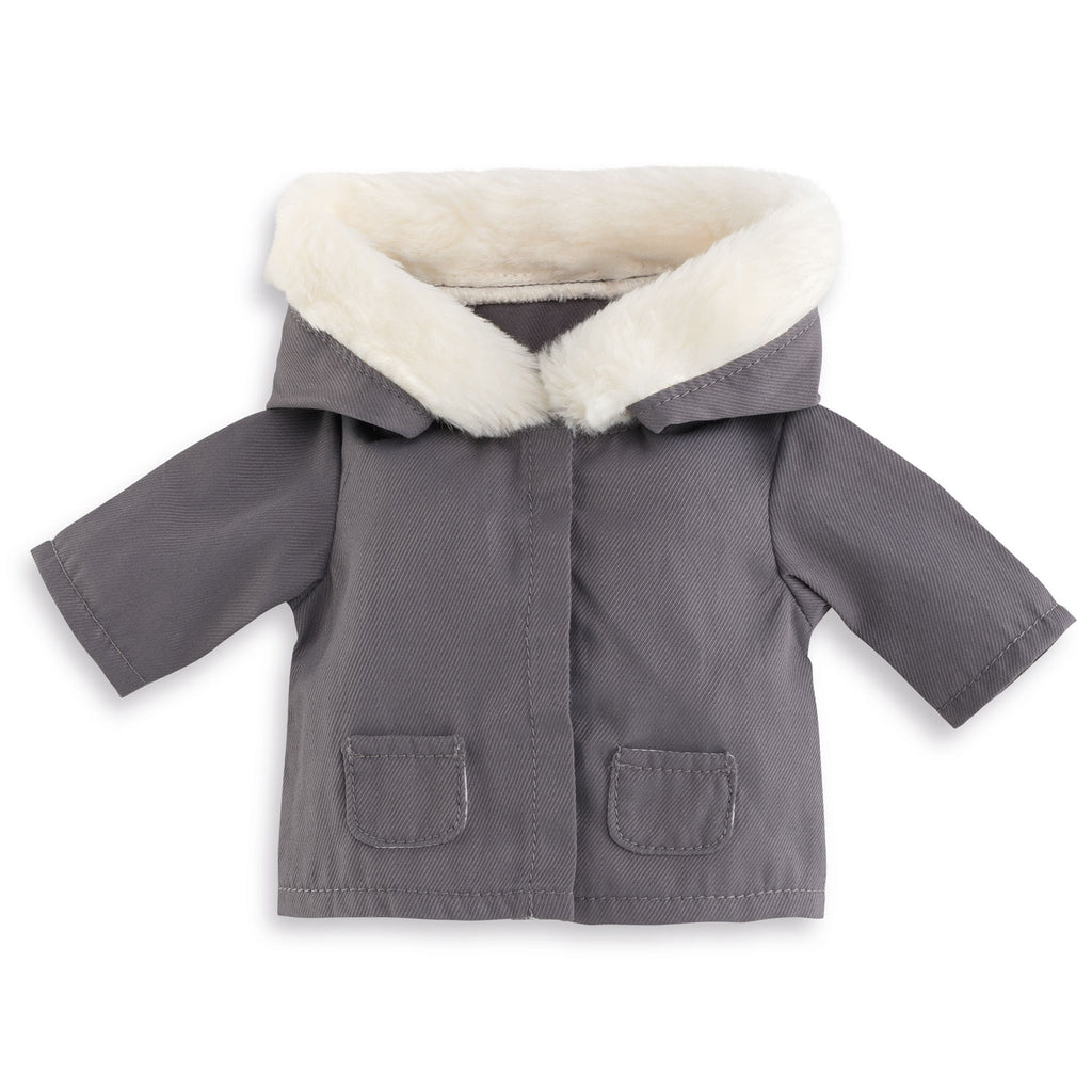 Deze donkergrijze poppenjas heeft twee zakjes en een witte bontkraag. De jas staat leuk op een spijkerbroek maar ook stoer op een rokje. Geschikt voor Corolle poppen van 36 centimeter.