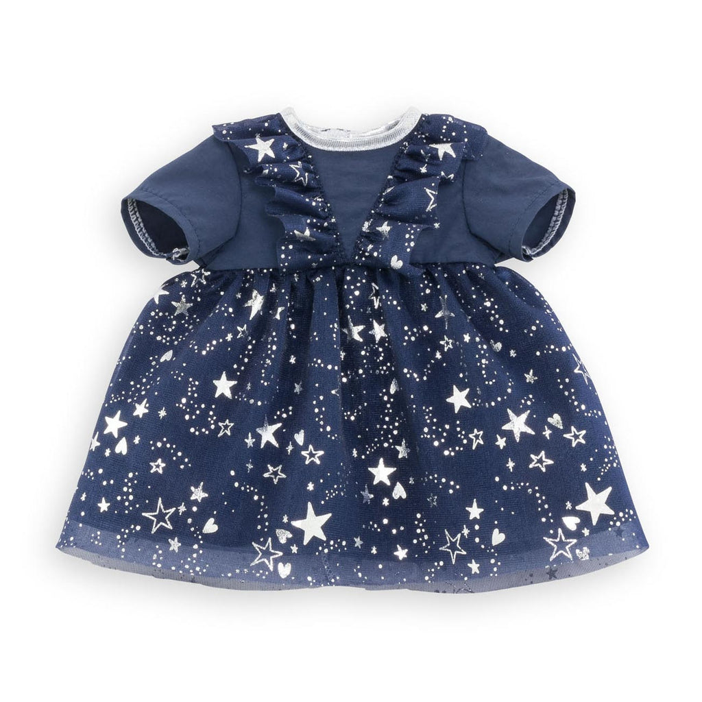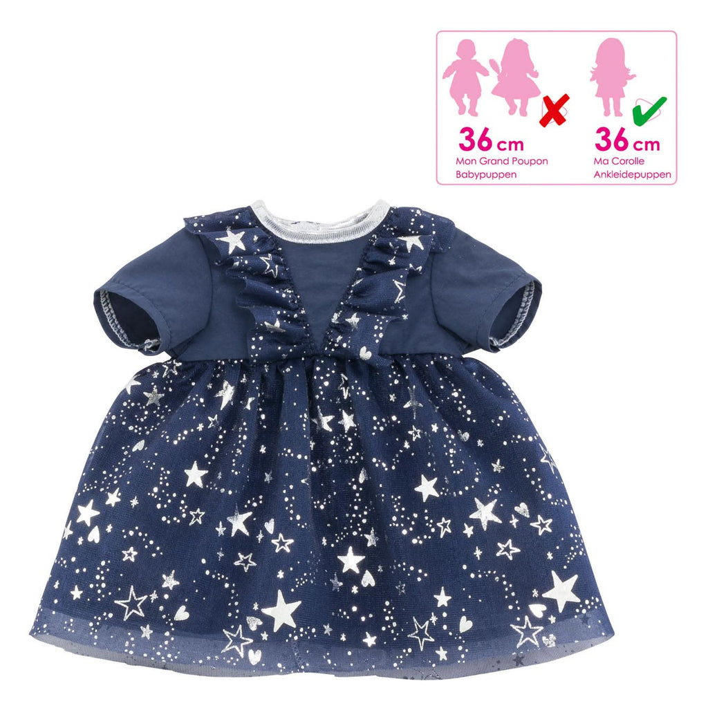 Met deze jurk met zilveren sterren schitteren je ma Corolle-poppen ‘s avonds met duizend lichtjes! Deze complete outfit bestaat uit een marineblauwe jurk met korte mouwen, met een zilveren sterrenprint op tulen petticoat en bandjes. De mooie zilveren kraag siert deze jurk subtiel voor een nog verfijndere look. De jurk is geschikt voor poppen van 36 centimeter groot. Ma Corolle: Mijn Pop, mijn verhalen! Deze outfit is geschikt voor kinderen vanaf 4 jaar oud. Wasbaar met de hand.