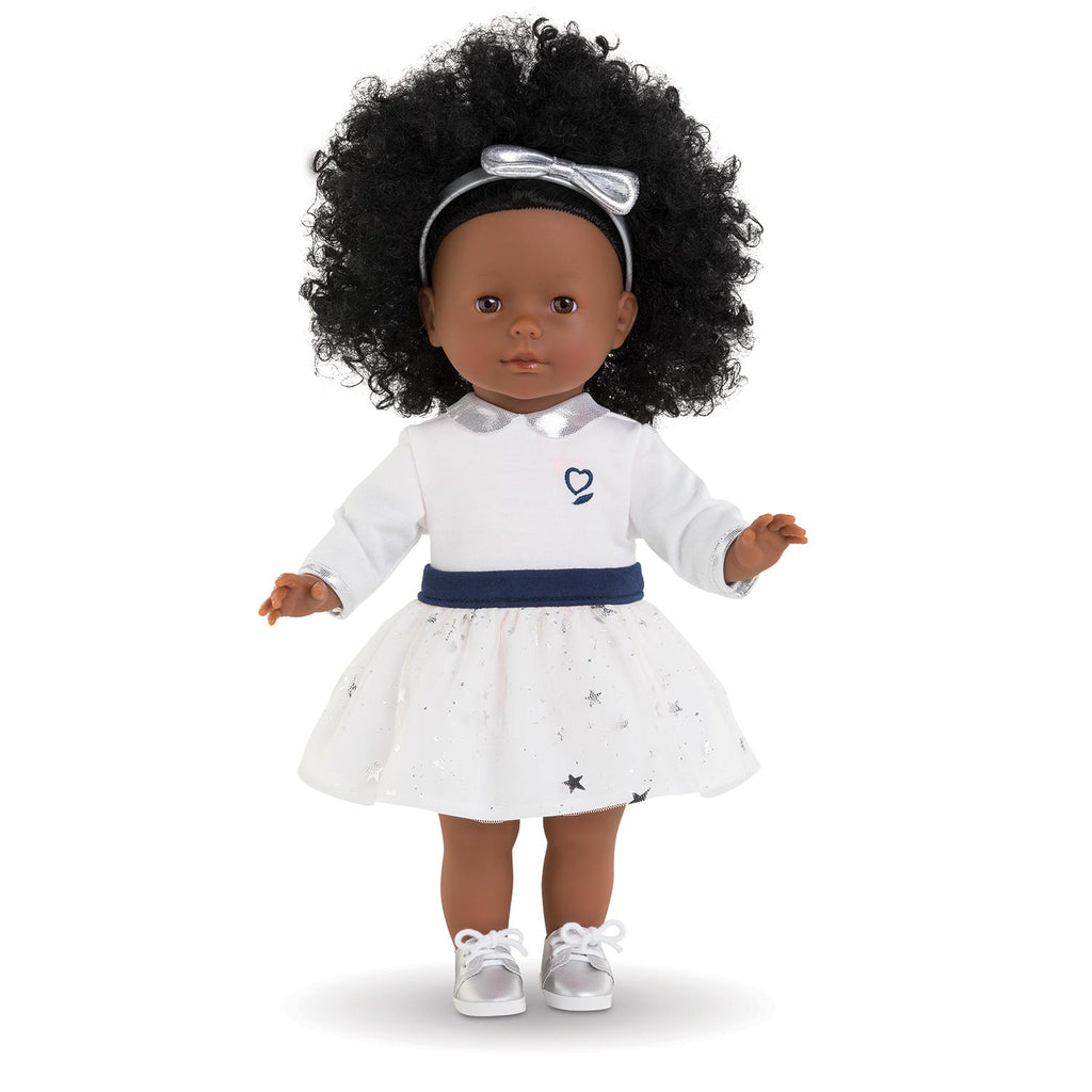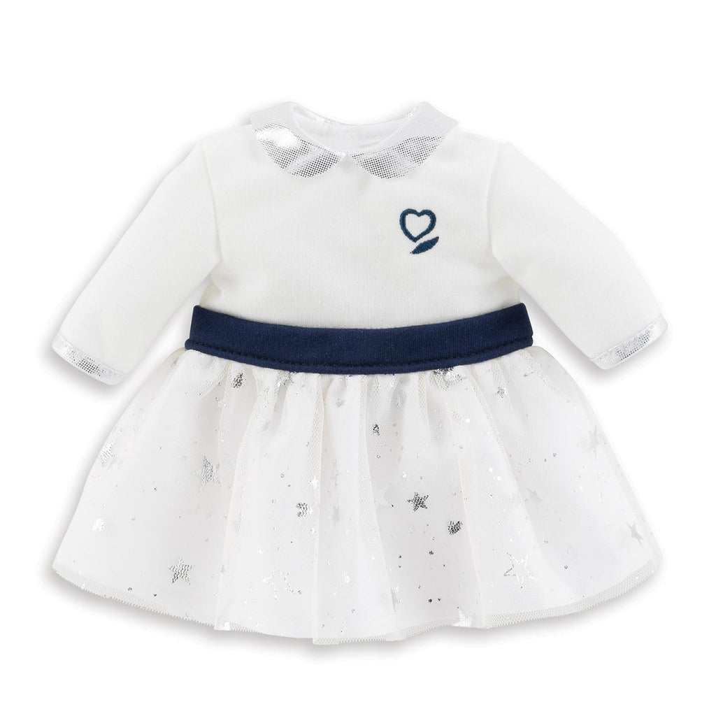 Wit poppenjurkje van Corolle met kraagje en sterretjes op het rokje. Geschikt voor poppen van 36 centimeter. Kan met de hand gewassen worden.