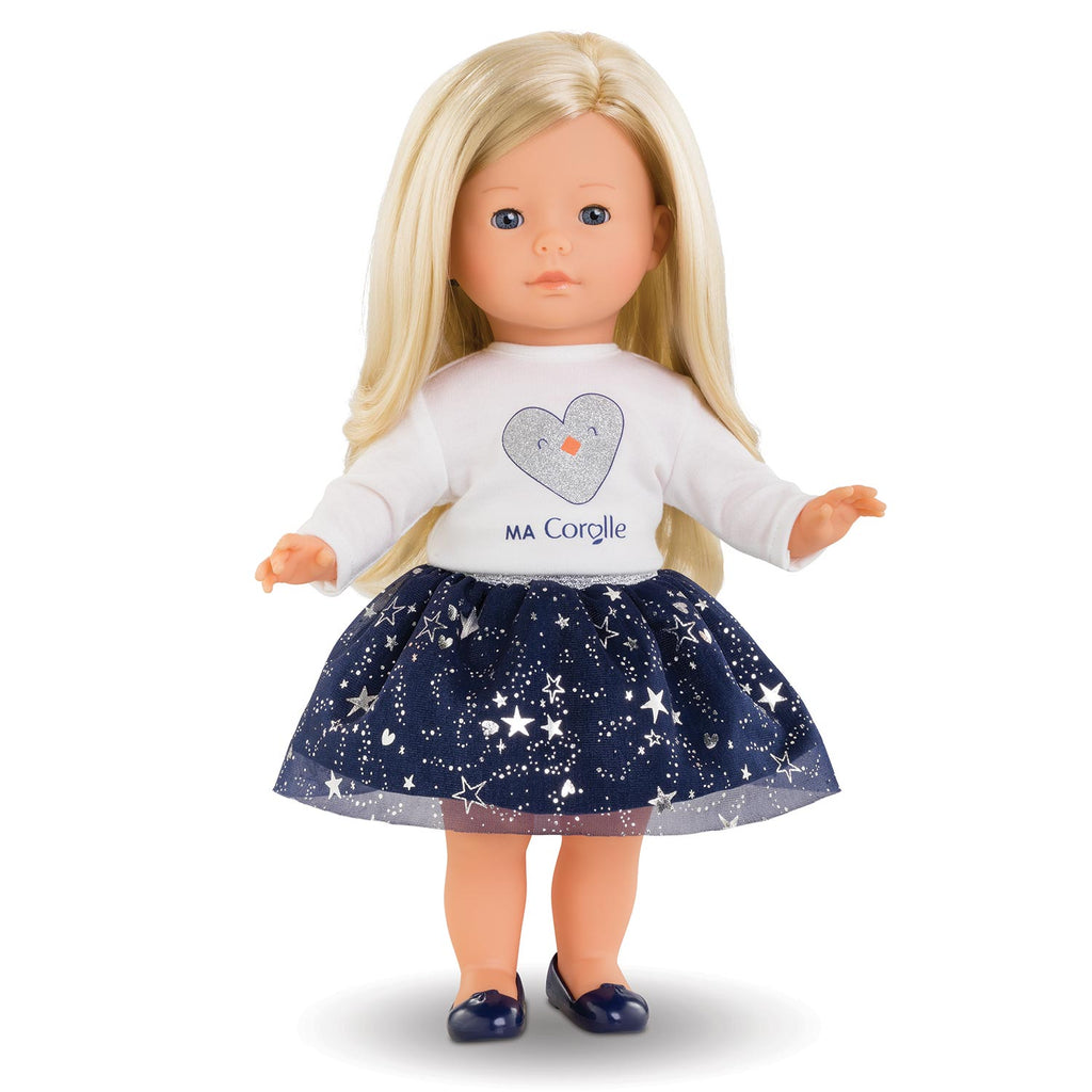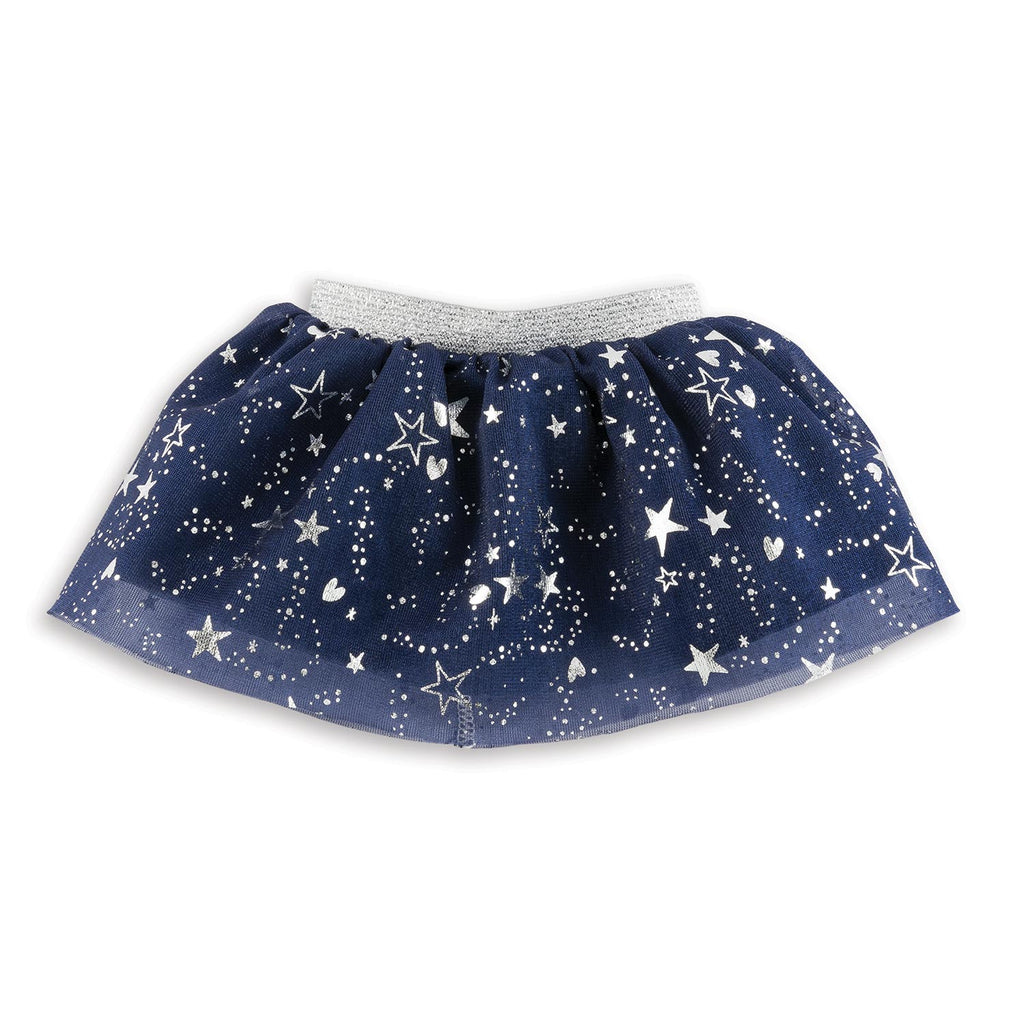 Poppenrokje van Corolle. Het rokje is donkerblauw en bezaaid met zilveren sterren. Geschikt voor poppen van 36 centimeter groot.