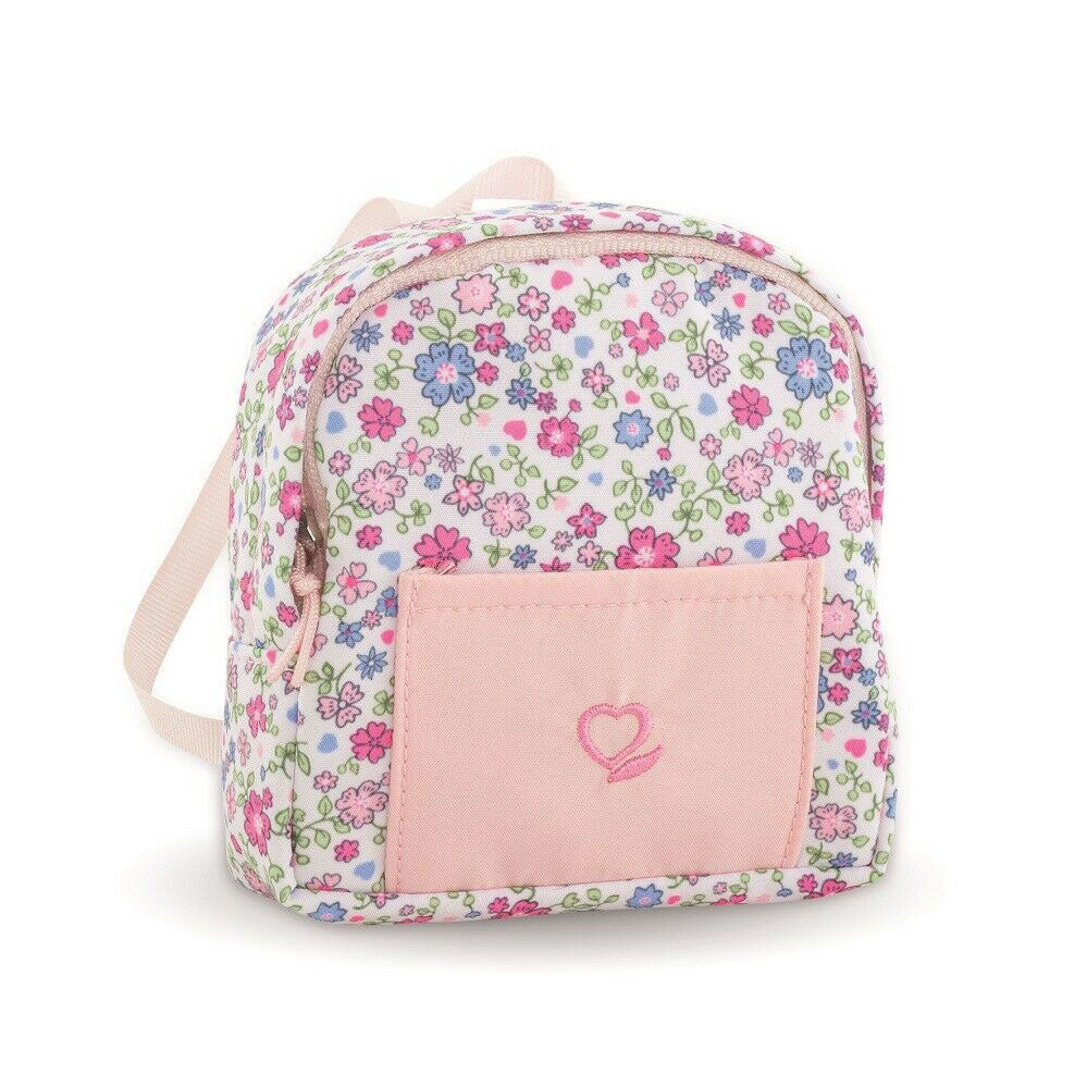 Ma Corolle poppenrugzak met een bloemenprint. De rugzak is voorzien van een rits aan de voorkant van de tas. Geschikt voor poppen van 36 cm.