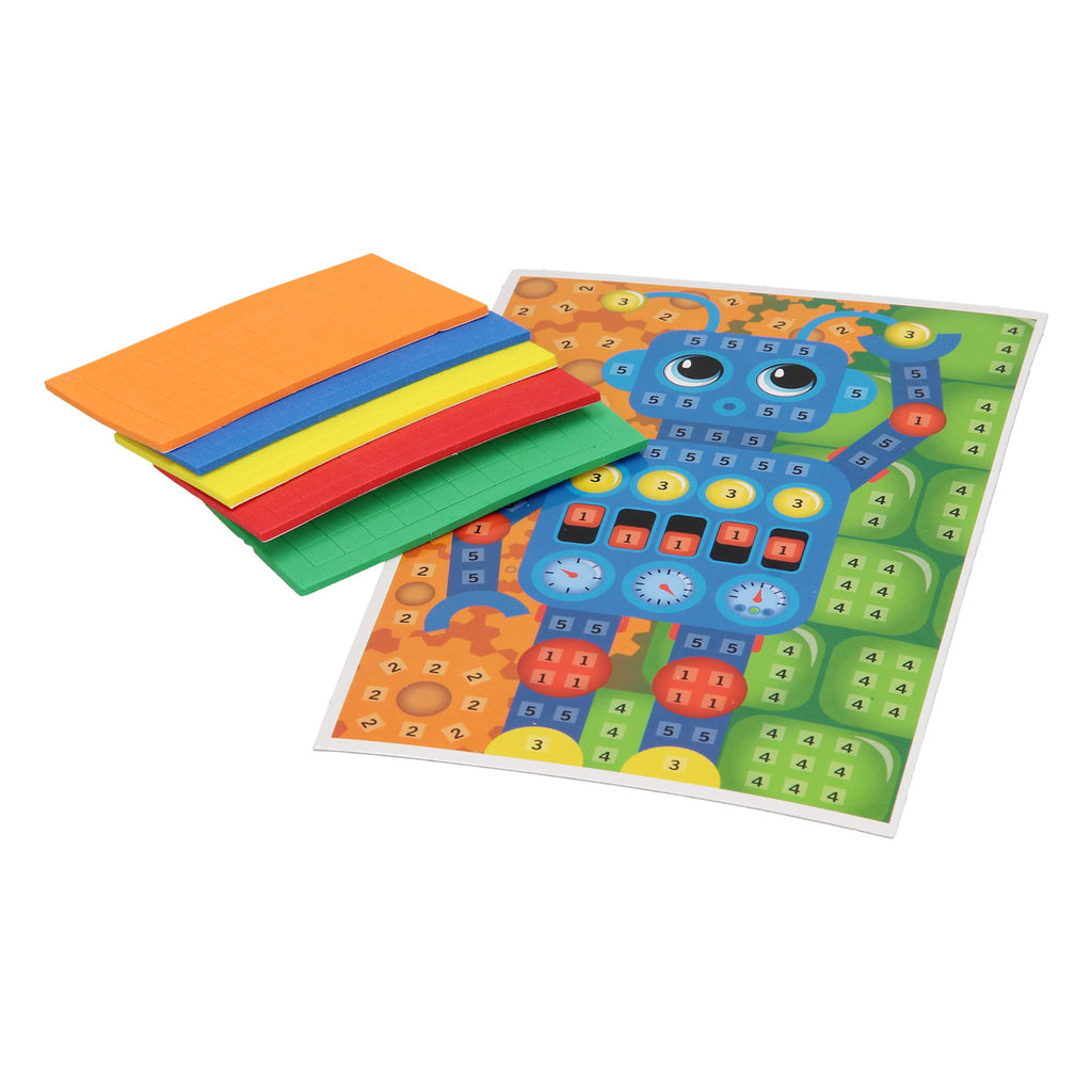 Inhoud: afbeelding van een robot, 250 foam stickers (rood, oranje, geel, groen en blauw).