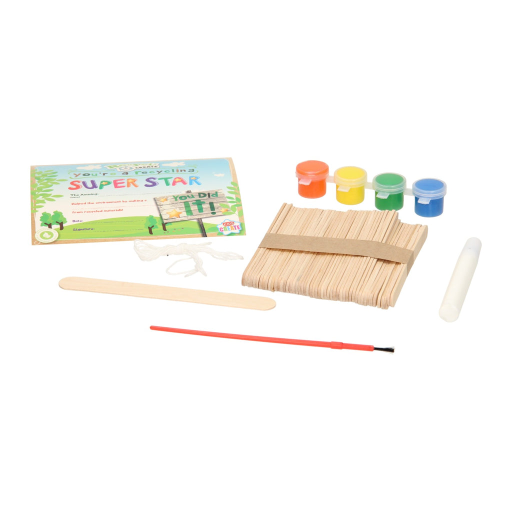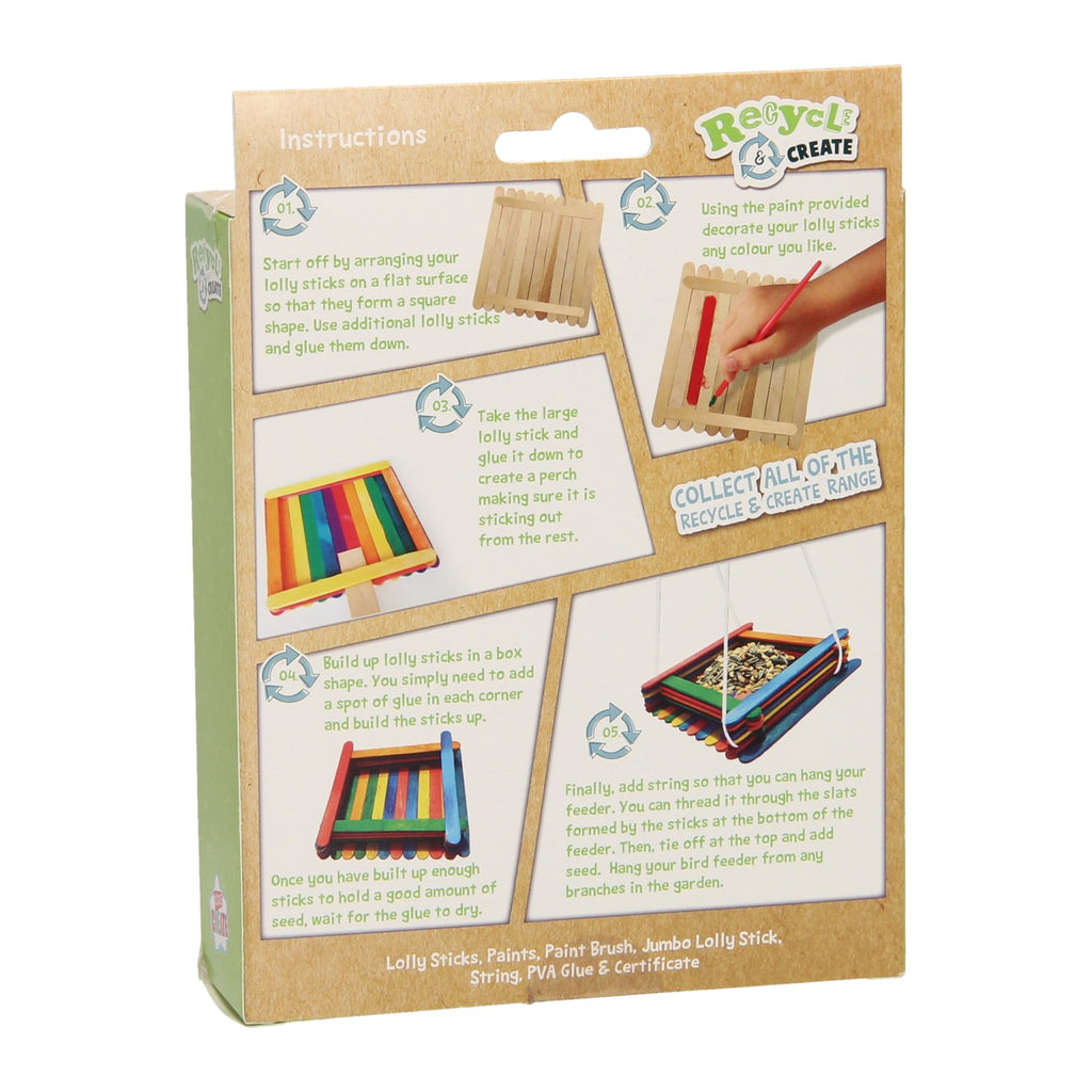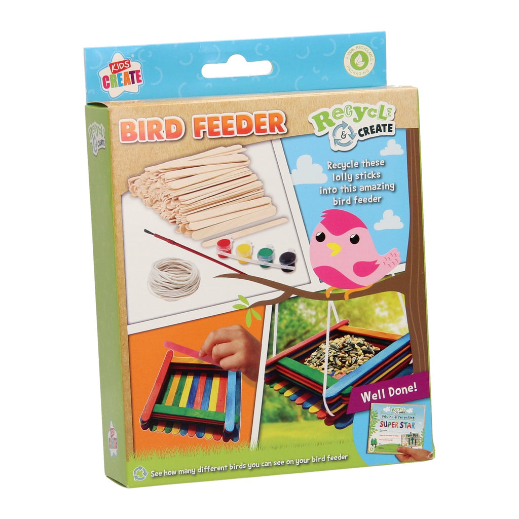 Maak je eigen vogel voederhuisje. Inhoud: ijsstokjes, penseel, lijmstick, verf (oranje, geel, groen, blauw), touwtje. Geschikt voor kinderen van 3 tot 6 jaar oud.