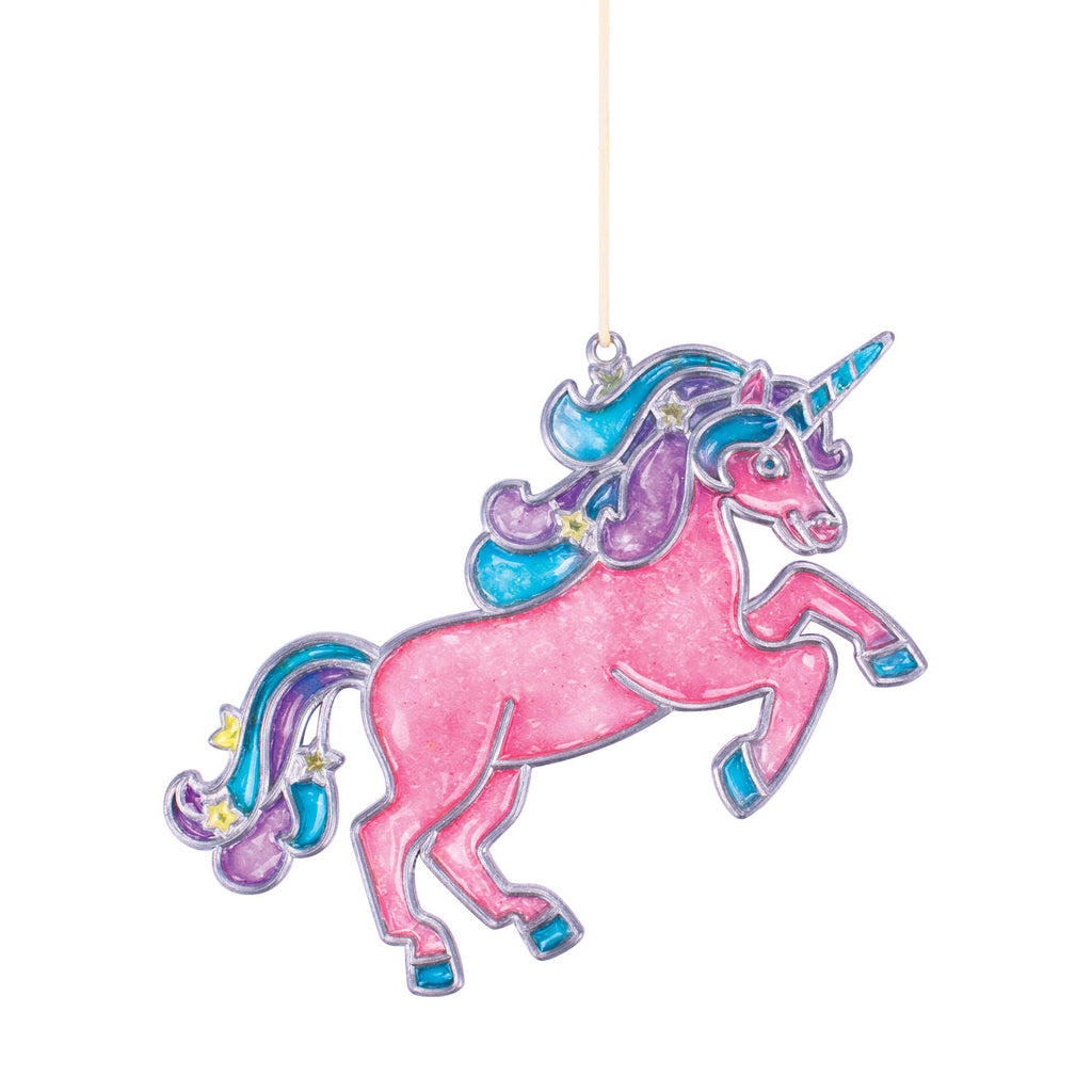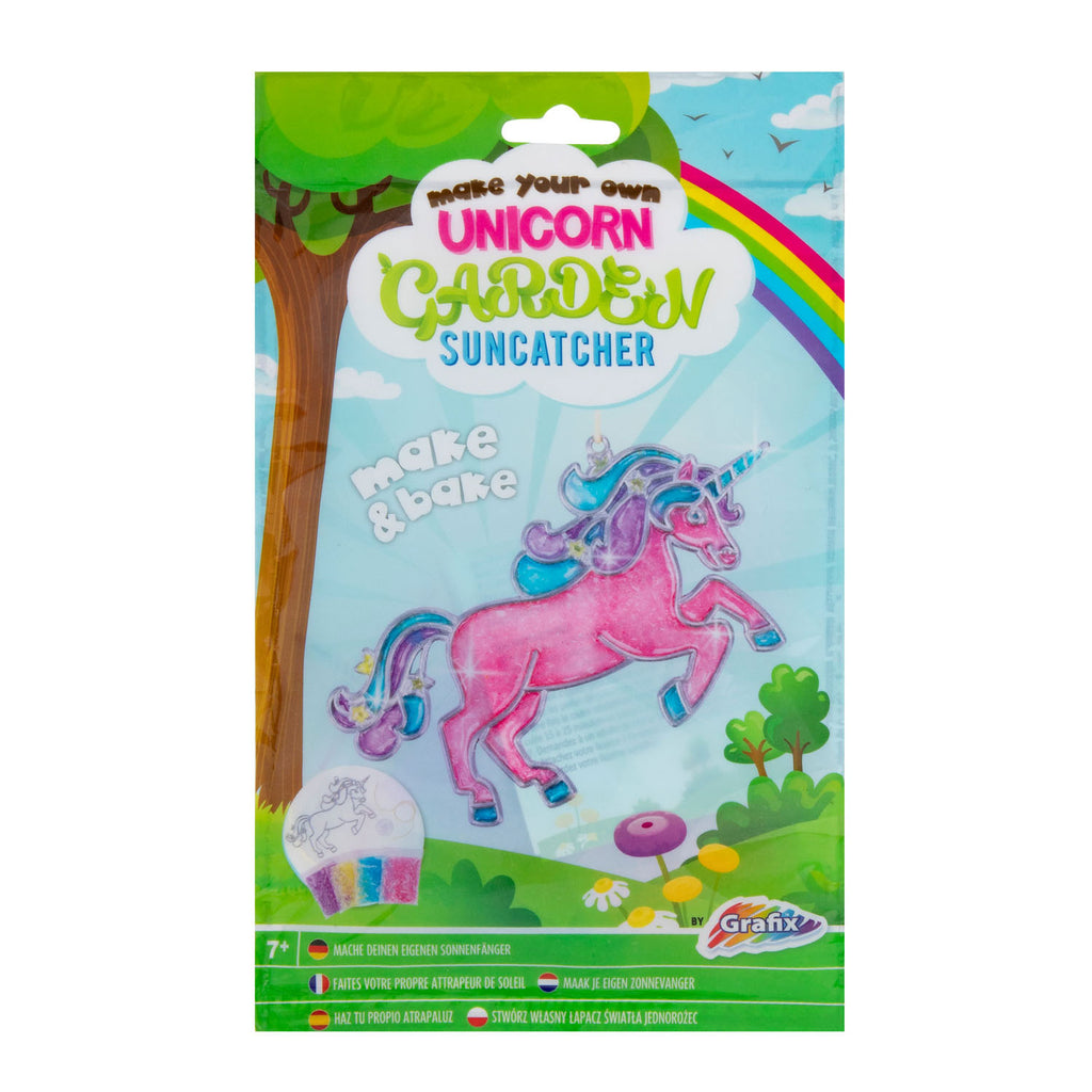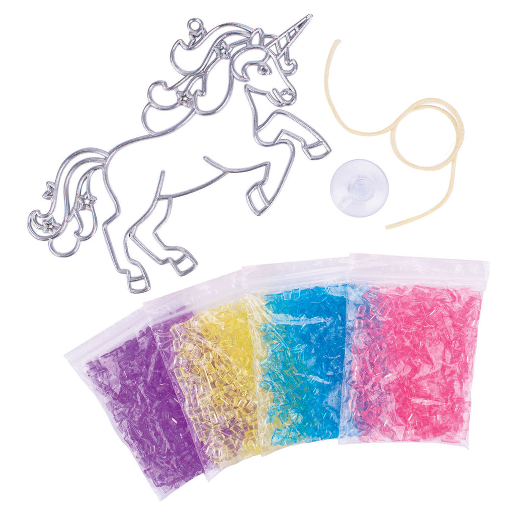 Maak met deze knutselset je eigen zonnevanger in de vorm van een eenhoorn. In de set vind je een eenhoornframe, vier sprankelende gekleurde smeltkorrels, een zuignap en de instructies. De zonnevanger is zo gemaakt: vul het frame met smeltkorrels, bak hem in de oven en je eenhoorn zonnevanger is klaar om opgehangen te worden! Geschikt vanaf 7 jaar.