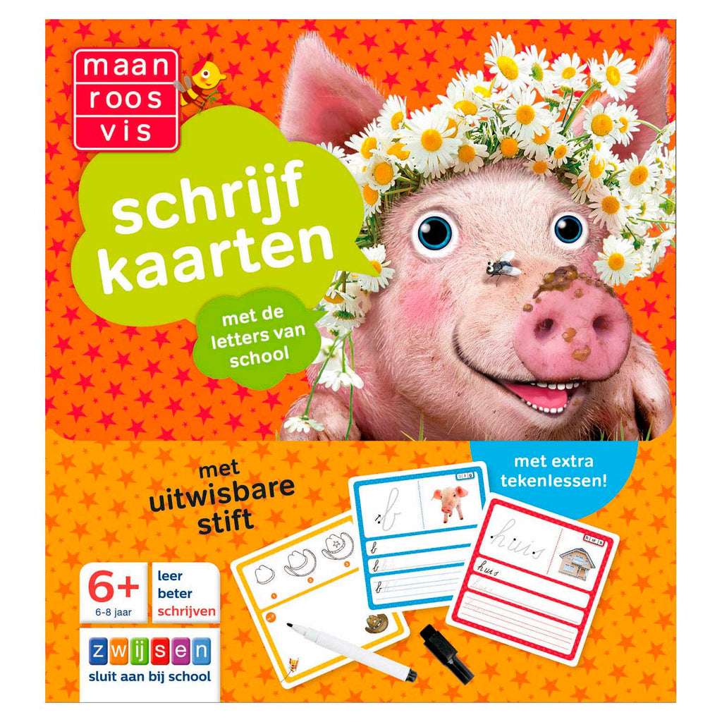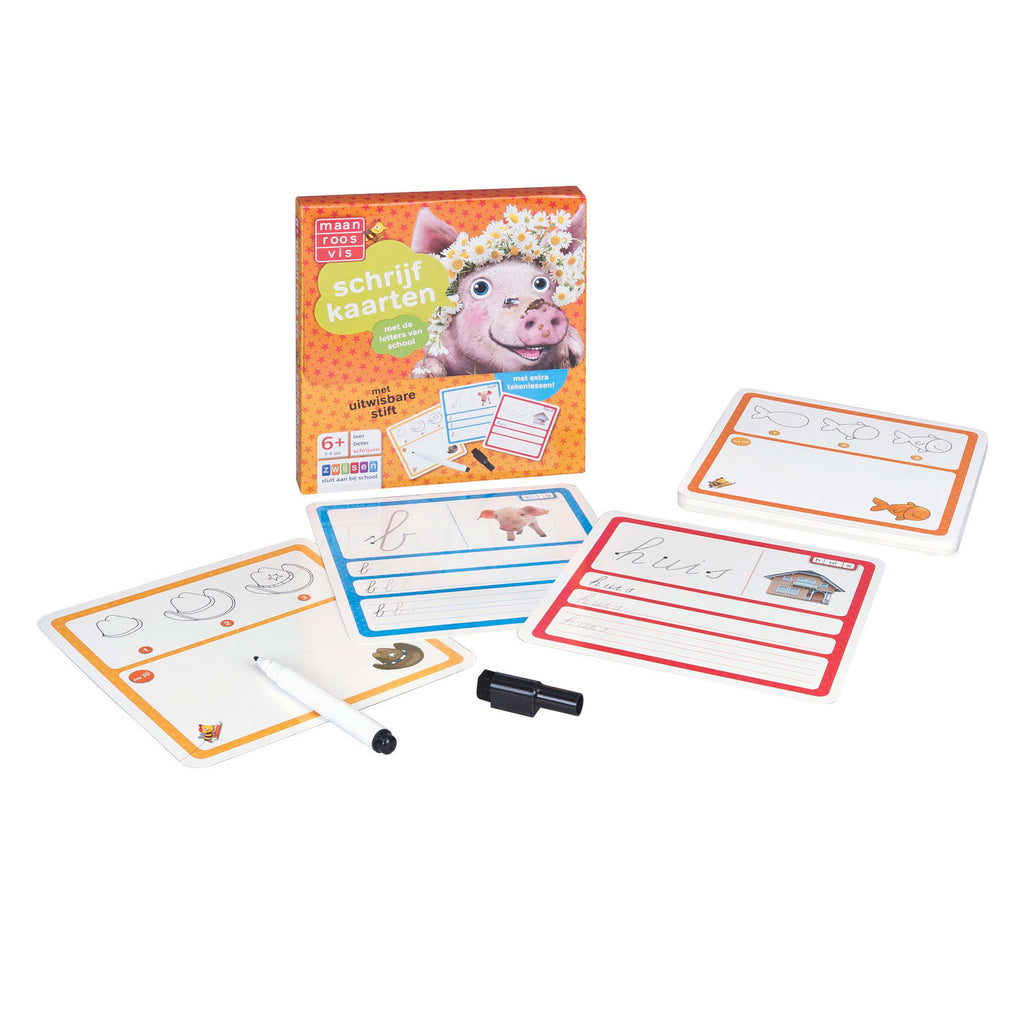 Schrijven leert een kind op school. Is er eenmaal interesse, dan wil een kind vaak meer. Daarvoor zijn er de Maan Roos Vis - Schrijfkaarten! Met deze kaarten oefent een kind een goede pengreep, fijne motoriek, oog-handcoördinatie en het schrijven van letters en woorden in gebonden schrift. De Maan Roos Vis - Schrijfkaarten zijn geschikt voor kinderen vanaf 6 jaar en uitwisbaar, zodat je er eindeloos mee bezig kunt. Als bonus zitten er bij de schrijfkaarten ook tekenkaarten, waarin je bijvoorbeeld een cowboyhoed leert tekenen.