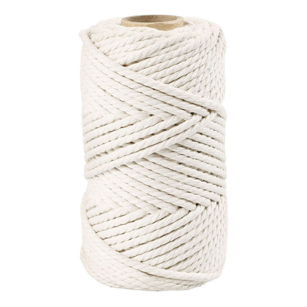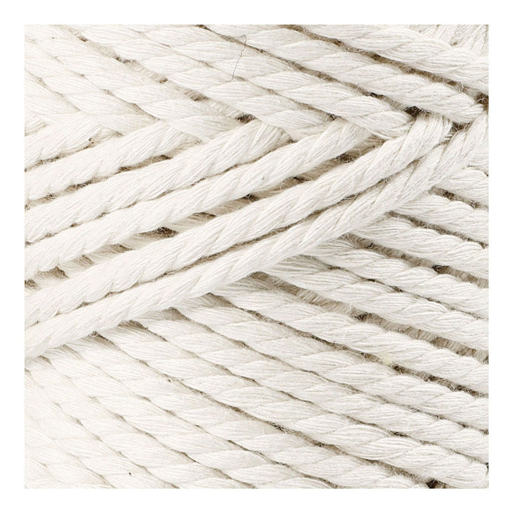 Drievoudig/3-draads macramégaren gemaakt van 80% gerecycled katoen en 20% polyester. Dit sterke macramé koord is ideaal voor het knopen van grotere projecten zoals wandkleden, hangende bloemenmanden, net-draagtassen etc..Macramé is een oude techniek waarbij je sterk garen of touw gebruikt om verschillende soorten knopen te knopen, die vervolgens verschillende patronen vormen. U kunt leren hoe je een aantal van deze knopen kunt maken met onze techniekvideo's. De activiteit vereist bijna geen gereedschap behalve het macramé-touw / -koord, hoewel het helpt om je knoopprojecten op een speciaal macramé-bord / klembord uit te voeren.