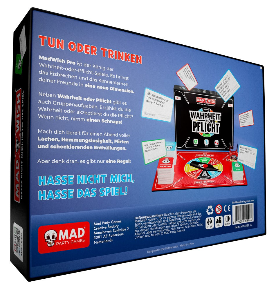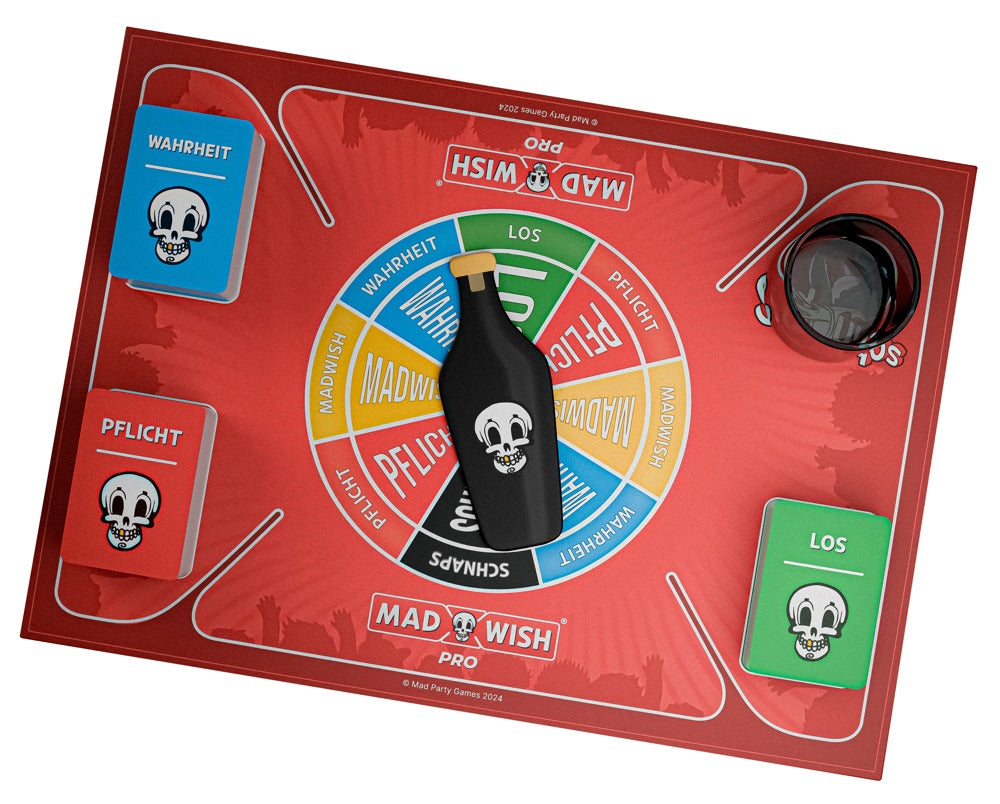 Het MadWish Pro Party Game van Mad Party Games brengt het allemaal samen: Drinkspel, truth or dare en spin the bottle - gecombineerd in één stijlvol spel! Brutale uitdagingen, verrassende onthullingen en veel plezier en gelach maken van elke spelavond een hoogtepunt. De fles wordt gedraaid - en de pret begint! Perfect voor feestjes, als voorgift, als cadeau of gewoon voor onvergetelijke avonden met vrienden.