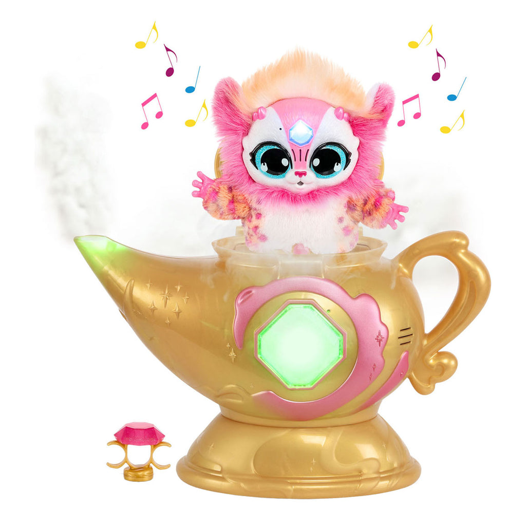 Ervaar échte magie met de Magic Mixies Magische Wonderlamp! Welke Mixie tover jij op Magische wijze uit de Toverlamp tevoorschijn? De Wonderlijke Mixie in jouw goudkleurige Lamp heeft lang geslapen en om hem wakker te krijgen, zul je allerlei magische fases moeten doorlopen. Voeg Magische Ingredienten toe en zie hoe de Edelsteen van de Toverlamp steeds verkleurt en verschillende geluiden laat horen. Let op het 'ding' geluid, want dat is het teken dat je over de Toverlamp moet wrijven en alleen dan zal er Magische mist te zien zijn! Je zult versteld staan wat er allemaal uit de Lamp tevoorschijn komt! Heb je alle fases goed doorlopen, dan is je roze Mixie klaar om de wijde wereld te betreden! Wrijf een laatste keer over de Wonderlamp en hij zal uit Magische mist tevoorschijn komen! Zijn edelsteen licht op en hij zal je begroeten. Geef hem een naam naar keuze en hij zal deze voor jou herhalen! Je interactieve Mixie reageert op aanraking en geluid. Doe wensen en laat hem balanceren op de Toverlamp. De Magische Toverlamp en je Wonderlijke Mixie zijn voorzien van 60+ geluiden, lichteffecten en reactie's. Speel keer op keer met de Toverlamp en beleef iedere keer weer een mistige onthulling van je Mixie óf een voorwerp naar keuze! De Magische Toverlamp is verkrijgbaar met een roze, blauwe of Regenboog Mixie. Leeftijdsindicatie: 5 jaar+.