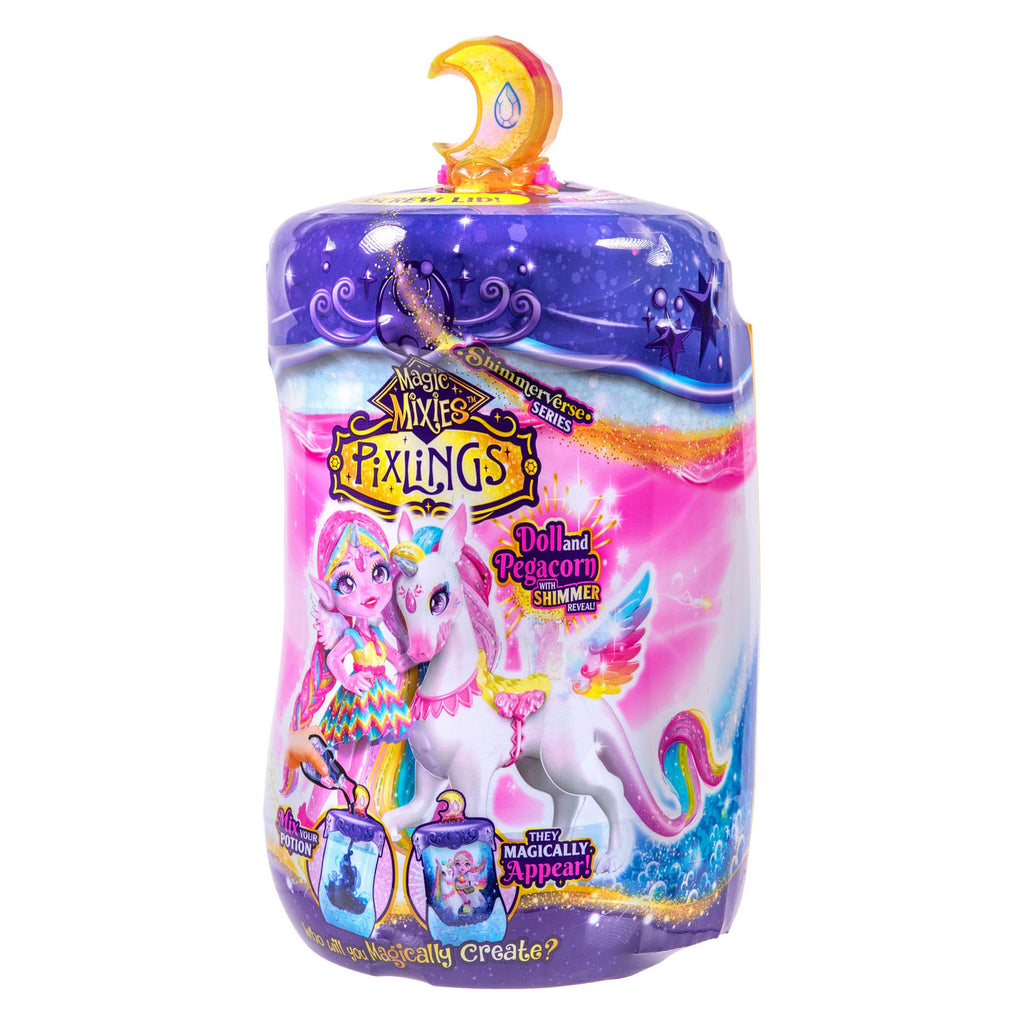 Betreed het Betoverde Rijk van de Magic Mixies Pixlings, waar toverdrankjes uit watervallen en fonteinen stromen. Nu is het jouw beurt om een Magisch Toverdrankje te maken en jouw Magic Mixies Pixling en haar gevleugelde Unicorn te onthullen! In de fles vind je alle ingrediënten om ze tevoorschijn te toveren. Maak het Toverdrankje door de stappen nauwkeurig te volgen. Het drankje zal borrelen en een glinsterend, wervelend donkerblauw mengsel worden. Zeg dan de magische woorden "Magicus Mixus", terwijl je de kristallen edelsteen draait en indrukt. Het drankje wordt helder en op magische wijze worden een prachtige regenboog Pixling en haar gevleugelde Unicorn Rainbow Star onthuld! Dat is dubbel zoveel plezier in één magisch drankje! De Regenboog Pixling heeft een kristallen edelsteen op haar voorhoofd en heeft altijd haar trouwe Unicorn Rainbow Star aan haar zijde. Je Pixling is 18,5 cm lang en heeft 7 beweegpunten zodat je haar gemakkelijk op haar vliegende vriend kunt zetten. Ze is prachtig gedetailleerd en heeft lang gevlochten haar in vele kleuren, draagt een modieuze jurk en handgemaakte schoenen. Style haar prachtige lang haar zoals jij dat wilt! Geschikt voor kinderen vanaf 5 jaar.