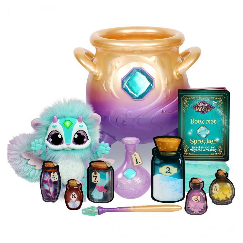 Ervaar échte magie met de Magic Mixies Magische Ketel! Wie tover jij op Magische wijze uit de Ketel tevoorschijn? Je Ketel wordt geleverd met een speciale Toverstaf en alle magische ingrediënten die je nodig hebt om een toverdrankje te mixen, waaruit je eigen schattige, interactieve vriendje zal ontstaan! Voeg stap voor stap alle magische ingrediënten, zoals de kristallen edelsteen en de magische veer, toe aan je Ketel. Na elke stap zal de Ketel het 'tik tik tik' signaal geven. Tik dan 3 keer met je toverstaf op de ketel en de Ketel zal reageren met groen licht en verschillende geluiden. Je zult versteld staan hoe uiteindelijk je pluchen Mixie uit de ECHTE mist tevoorschijn komt. Je Magische Mixie reageert op aanraking en op je toverstok. Hij vindt het heerlijk om samen met jou toverspreuken uit te voeren en je kunt zelfs een wens doen als zijn edelsteen oplicht! Hoe meer je je Magische Mixie koestert en verzorgt, hoe sterker zijn energieniveau wordt.