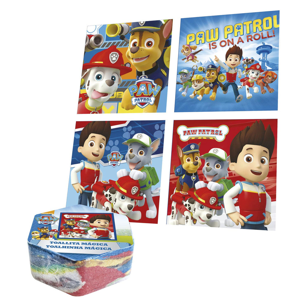 Magisch handdoekblokje om in het water te leggen. Zie het ontvouwen tot een handdoek van 30x30 centimeter met een Paw Patrol-print!