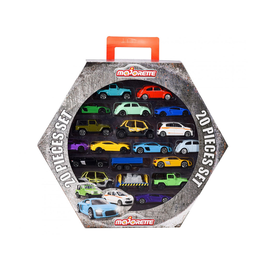 Cadeauset van 20 Majorette speelgoedauto's van kunststof en metaal. De auto’s hebben een lengte van 7,5 cm en hebben een schaal van 1:64. Gemaakt van metaal en kunststof, geschikt voor kinderen vanaf 3 jaar.