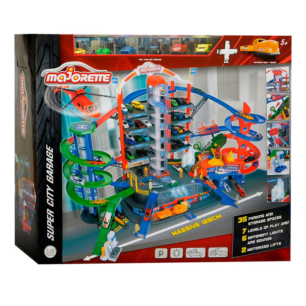 Met de Majorette Super City Garage heb je alles in huis om uren lang te spelen! De garage is gemaakt van kunststof, is 73 cm hoog en is voorzien van 7 verdiepingen, 2 gemotoriseerde liften, 35 parkeerplaatsen, 6 verschillende geluiden en licht en een helikopterplatform. Rij met de auto's naar beneden en was de auto's in de wasstraat. Op de begane grond van de garage rijdt een batterij-aangedreven trein met wagon. De speelset komt inclusief 6 metalen auto's, helikopter en trein met wagon. De set werkt op 4 AAA batterijen en 3 C batterijen (niet inbegrepen).