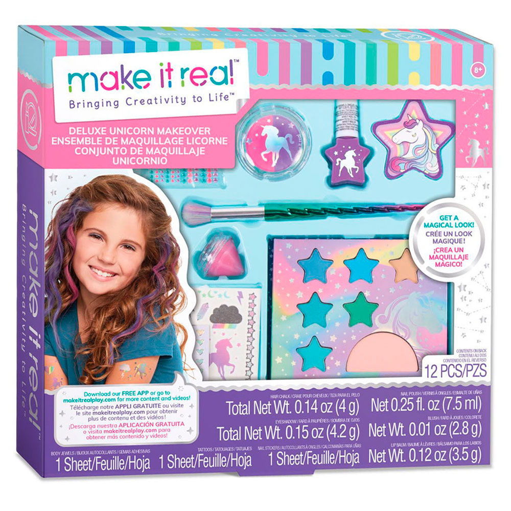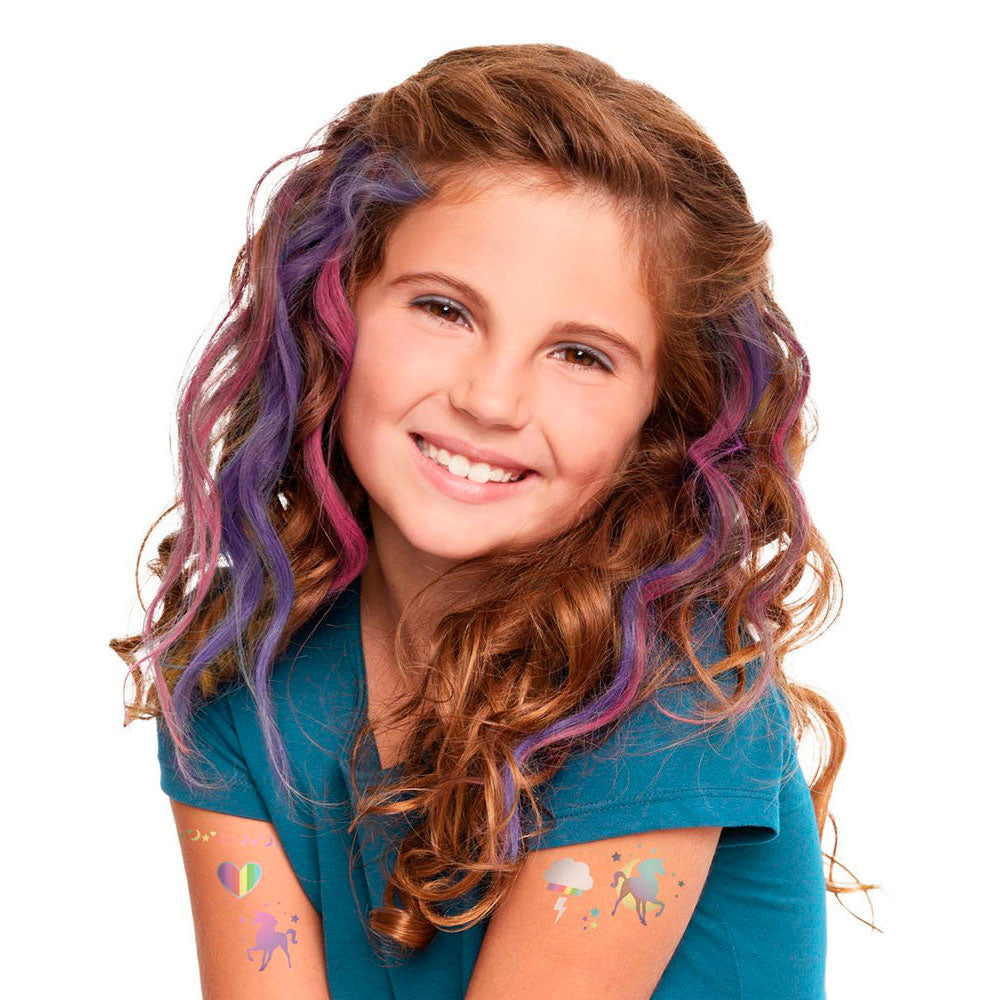Maak jezelf en je vriendinnen prachtig op met deze make-up set! Jullie kunnen ook nog jullie nagels lakken en jullie haar van kleur laten veranderen met het haarkrijt in paars en roze. Maak de look af met de diamantjes en eenhoorn plaktattoos! Inhoud: eenhoornthema haarkleurkrijt, nagellak, lipgloss, oogschaduw, plaktattoos, diamantjes, make-up accessoires.