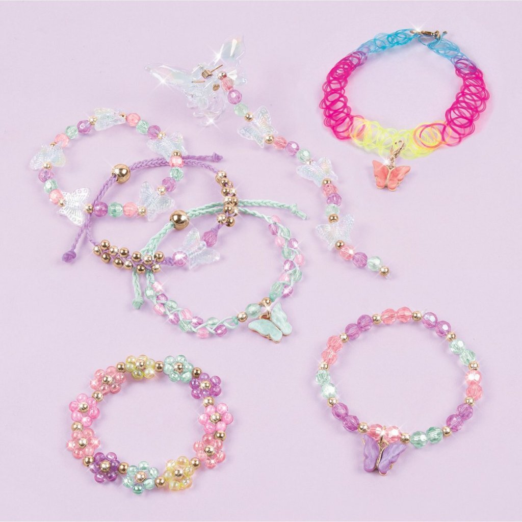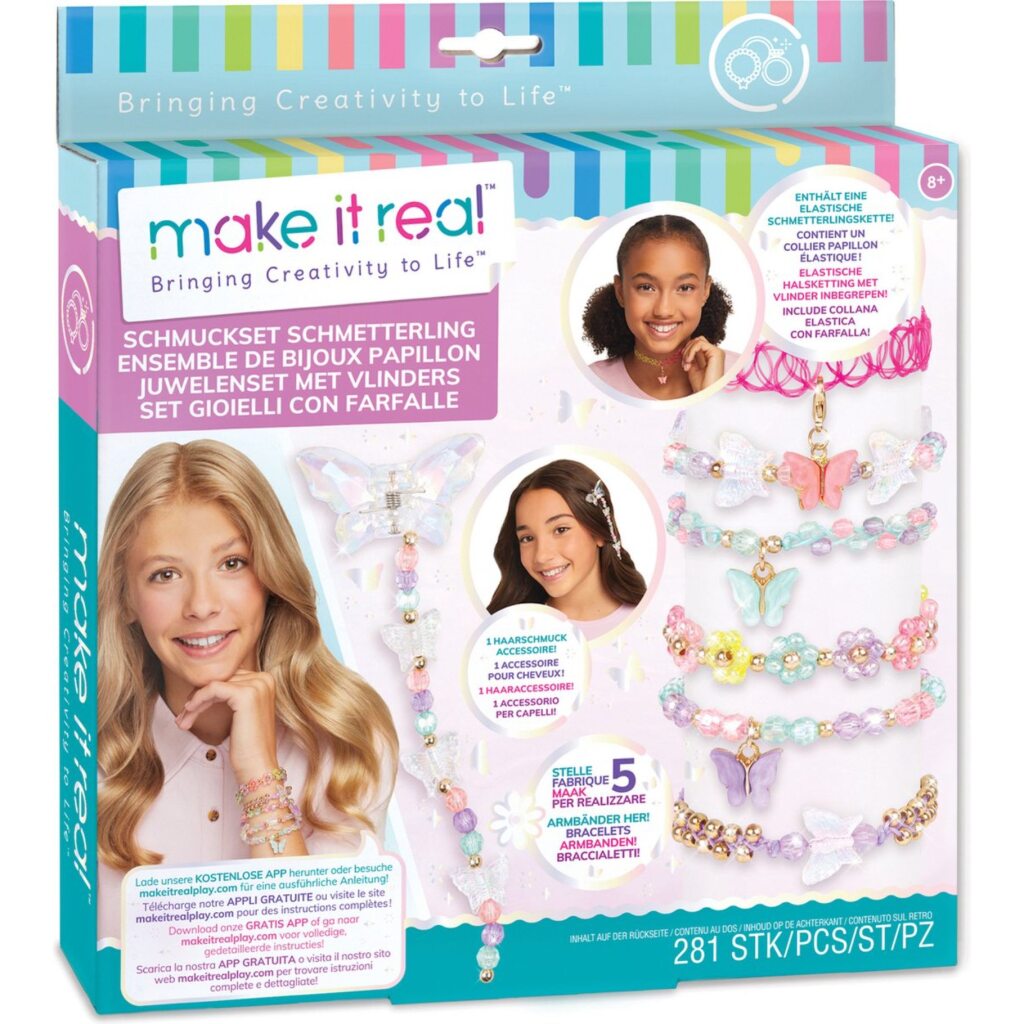 Laat je vleugels uitslaan met deze vlinder sieradenset! Dit doe-het-zelf sieradenpakket begeleidt jonge kinderen en tweens om hun eigen modieuze sieraden en haaraccessoires te ontwerpen en te creëren met geweldige vlinderbedels, gekleurde kralen en koord. ALLES INBEGREPEN. Dit sieradenpakket heeft alles wat je kind nodig heeft om tot 5 opvallende bedelarmbanden, een choker ketting en een haarklem te maken. Het bevat nylon koord, meer dan 270 verschillende kralen, een haarklem in vlindervorm, een elastische choker met karabijnsluiting, bedels en meer! GEWELDIG CADEAU-IDEE. De ontwikkelingsspeelgoed van Make It Real zijn geweldige cadeaus voor kinderen en tweens, waardoor ze vaardigheden ontwikkelen die hen zullen helpen succesvol te zijn als de toekomstige leiders en makers van morgen. Dit doe-het-zelf vlinder sieradenpakket biedt een leuke en creatieve activiteit PERFECT VOOR KINDEREN VANAF 8 JAAR.