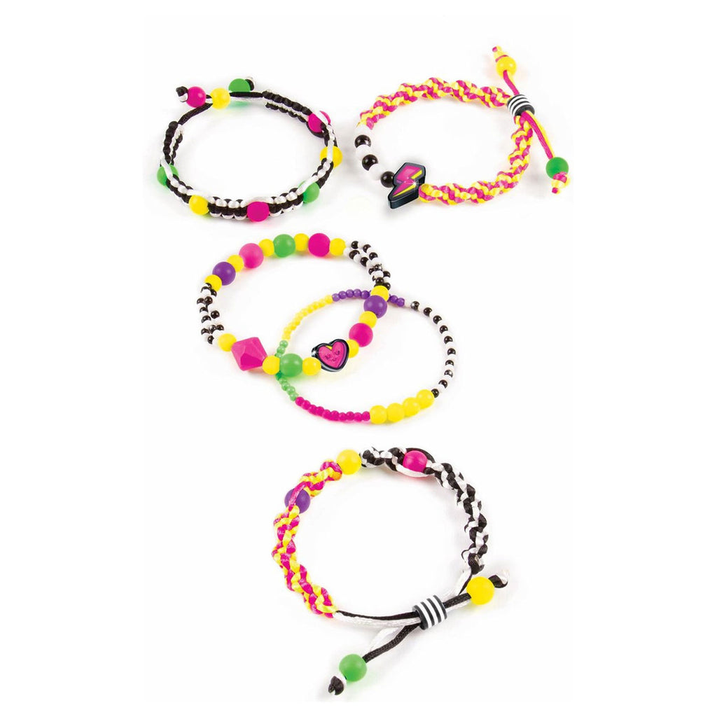 Jonge ontwerpers kunnen hun hart ophalen met dit 'Do It Yourself' Armbandjes pakket. Mix & Match de verschillende neon en zwart/wit gekleurde kralen, touwtjes en bedeltjes en maak 5 fantastische, unieke armbandjes! Ga naar www.makeitrealplay.com en leer alles over dit pakket.