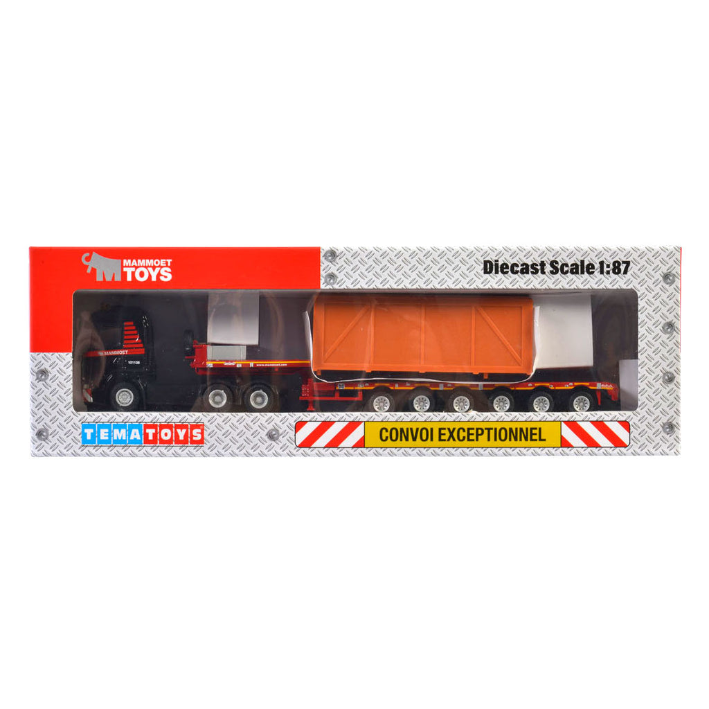 Word zelf de chauffeur van deze grote zwart met oranje vrachtwagen met een grote aanhanger met container! De vrachtwagen is gemaakt van metaal en kunststof.