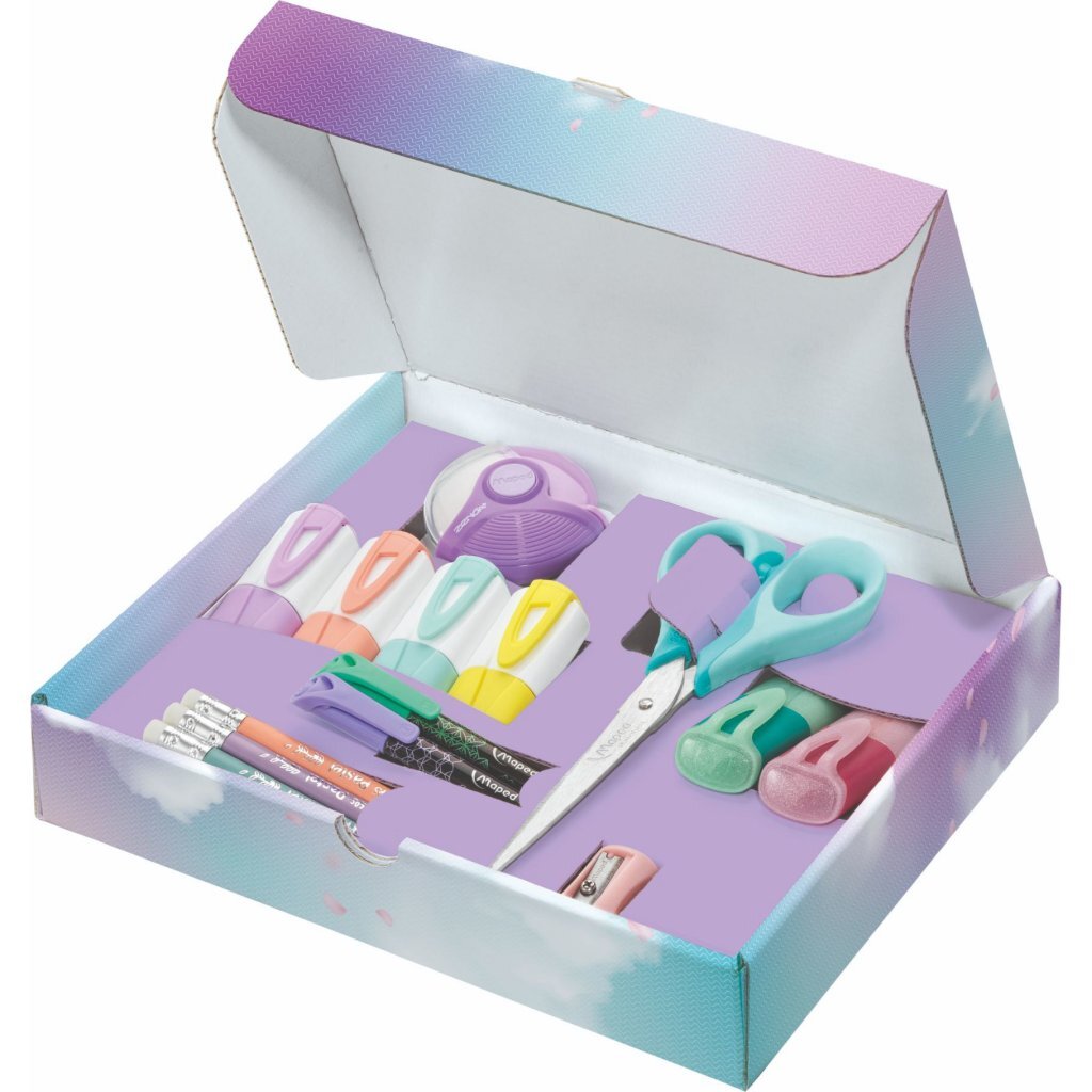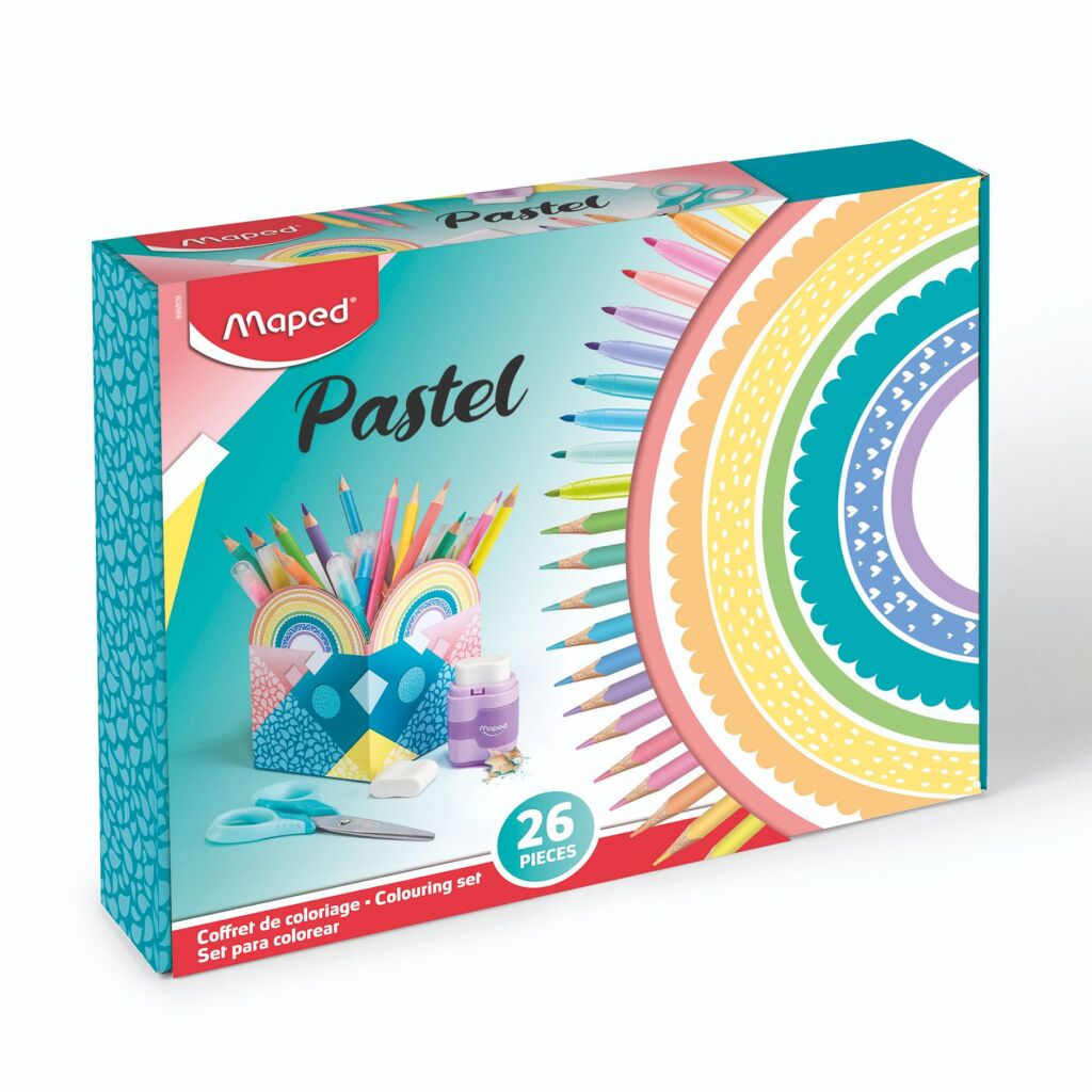 Maped Pastel Startset Kids met o.a. potloden, markers, fineliners en schaar. 26-delig.