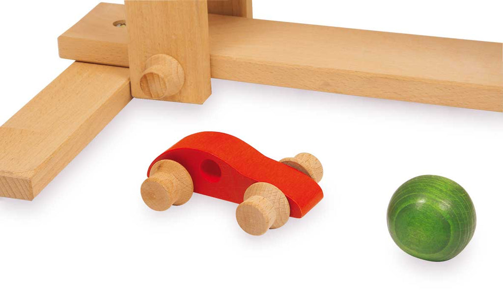 Gemaakt van fijn vervaardigd massief hout, brengt deze grote knikkerbaan beweging in het plezier! Felgekleurde ballen, een auto, een draaiende schijf en een ton met een bel erin rollen over de rails met veel gerinkel en gekletter! Of ze nu na elkaar of afzonderlijk van de ren worden gerold - de rollende elementen zijn een genot voor je ogen en oren! Een snelle montage is gegarandeerd door de schroefdraaddelen die bovendien ruimtebesparend en gemakkelijk te vervoeren zijn. De dwarsbalken met schroefdraad op de basis zorgen voor een stevige staande positie.