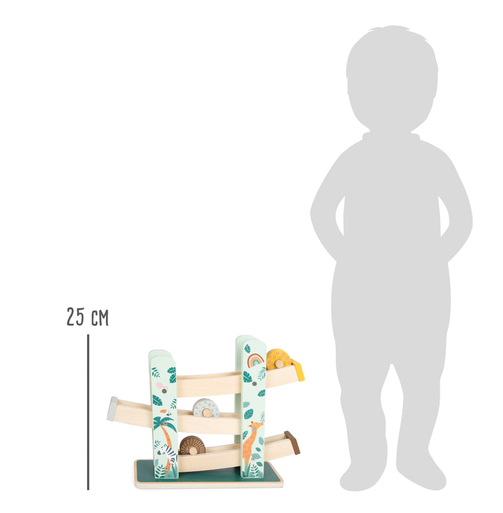 Cruisen door de wildernis met vaart! Drie verschillend gekleurde houten wielen versierd met patronen racen over de drie hellingen van deze houten knikkerbaan in populaire safari-look. De afdaling is versierd met rijk gedetailleerde safaridieren en trendy bladmotieven.