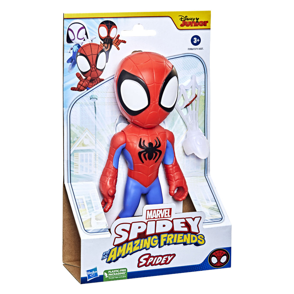 Het is Spidey-tijd! De supergrote actiefiguren van Spidey and His Amazing Friends van 22,5 cm zijn gemaakt om de verbeelding te stimuleren. Deze grote, beweegbare superheldactiefiguren ogen vriendelijk en zijn klaar om mee te spelen! Kinderen kunnen het bijgeleverde webaccessoire aan de pols van de figuur vastmaken en het hoofd en de armen van de figuren in leuke actieposes plaatsen om favoriete scènes uit de Marvel-animatieserie op Disney Junior na te spelen. Dit Spidey-speelgoed is een geweldig geschenk voor kinderen vanaf 3 jaar die dol zijn op de superheldenavonturen van het Spidey-team. Copyright MARVEL. Alle handelsmerken en geregistreerde handelsmerken zijn het eigendom van hun respectievelijke eigenaars. Hasbro en alle gerelateerde termen zijn handelsmerken van Hasbro.