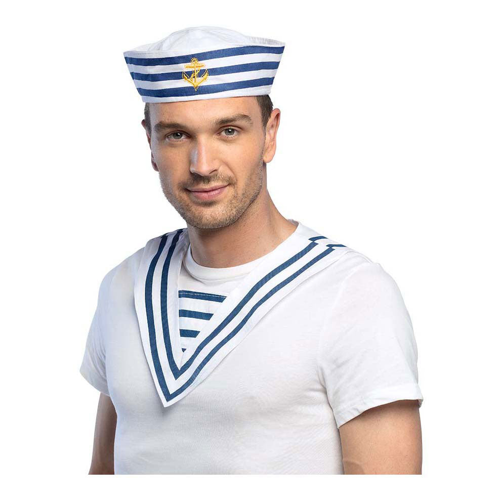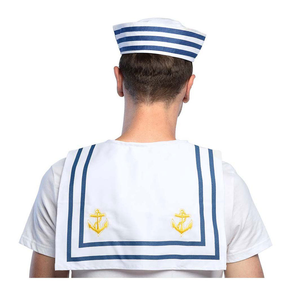 Witte matrozenkraag met blauwe strepen en goudkleurig ankerborduursel. Geschikt vanaf 14 jaar.