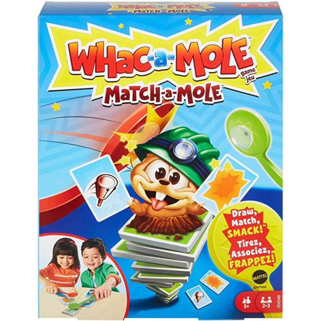 Mattel Mollen Meppen is een hilarisch kaartspel voor kinderen waarin iedereen de juiste kaart probeert te vinden en tegelijkertijd te pakken. De bovenste molkaart moet worden toegewezen aan de kleuren en symbolen van de spelerskaarten. Als een combinatie van openliggende kaarten overeenkomt met die in het midden, moet je de mol meppen. Wie de kaart met de zuignap van de mepper weet te pakken, mag deze houden. Als je de eerste speler bent die 5 kaarten verzamelt, win je het spel! Voor 2 tot 3 spelers vanaf 5 jaar.
