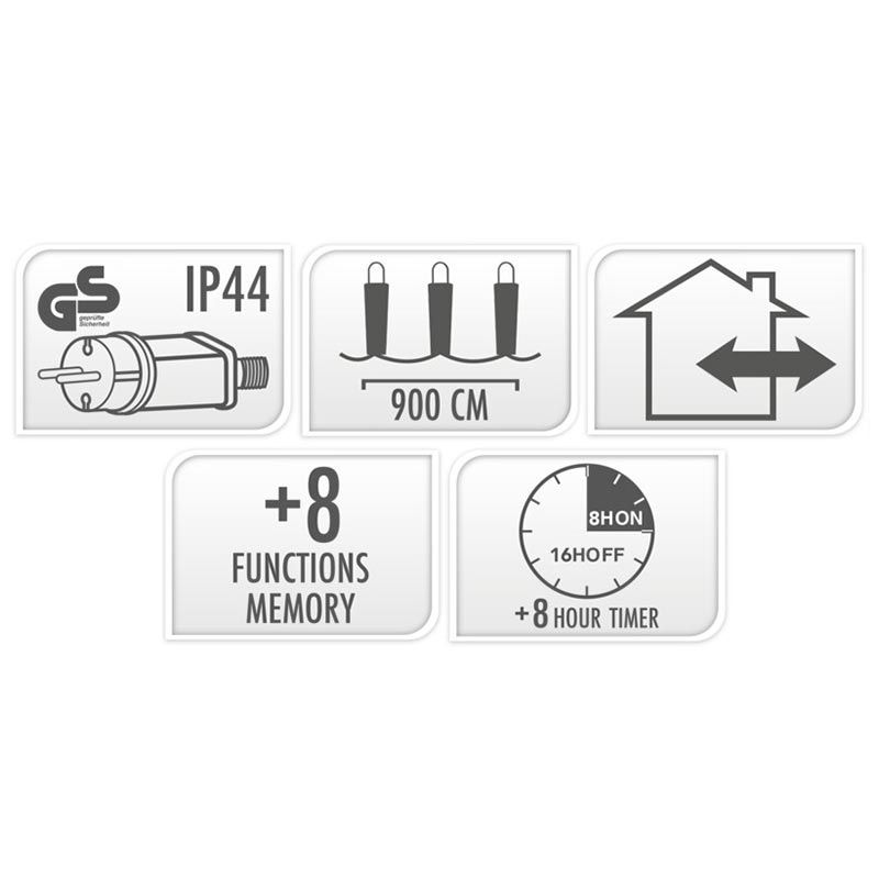 - 8 lichtfuncties: 1.Combination, 2. In waves, 3.Sequential, 4. Slo glo, 5. Chasing/flash, 6.Slow fade, 7.Twinkle/flash, 8.Steady on