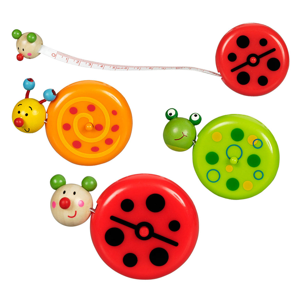 Vrolijk gekleurde rolmaat met houten figuurtje. Leverbaar in verschillende uitvoeringen.