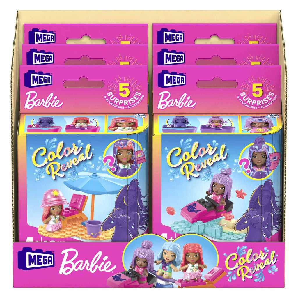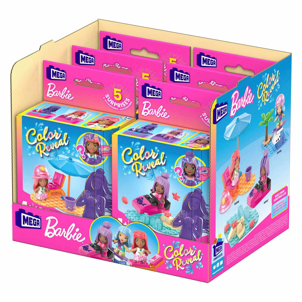 MEGA Barbie Color Reveal bouwsets zitten boordevol verrassingen - maak de doos maar open! De look van elke micropop is een magisch mysterie dat wacht op onthulling. Open het hartvormige bad en verwijder de bouwplaat - daar vind je 2 verrassingszakjes. In de zakjes ontdek je meer dan 3 verrassingen, waaronder 1 Color Reveal micropop. Vul het hartvormige bad met warm water, leg de micropop erin en beweeg haar rond om haar look te onthullen. Doop dan de spons in ijskoud water om haar uiterlijk te veranderen. Plaats ook de andere verrassingsvoorwerpen in het warme water voor nog meer speelplezier. Geef alle accessoires en je micropop een plaatsje op de hartvormige bouwplaat en bedenk je eigen avonturen. Elke serie heeft een uniek thema. Deze micropoppen hebben van alles te maken met zand en zon - wat ontdek jij? Verzamel alle 3 sets in de serie en verwissel de accessoires - de mogelijkheden zijn eindeloos. Apart verkrijgbaar; kleuren en details kunnen variëren.