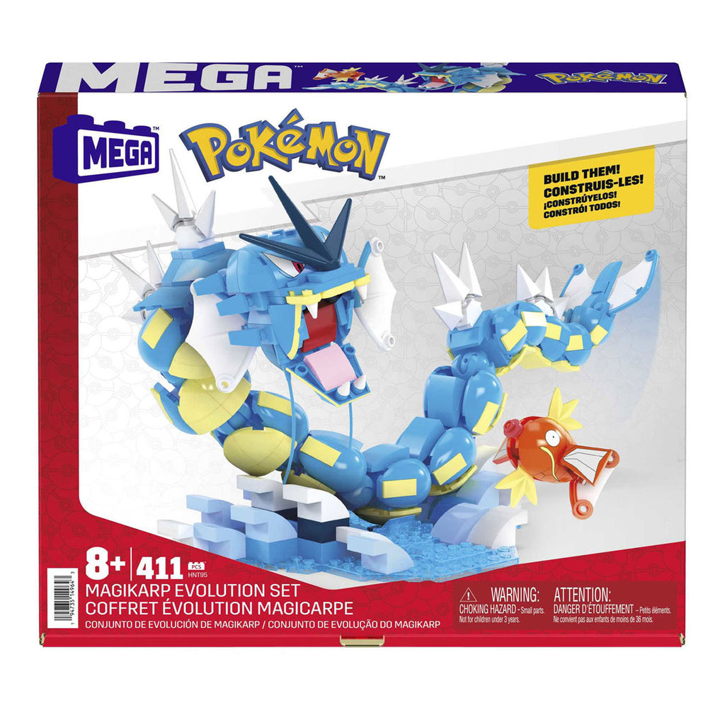 Neem een duik met deze Magikarp Evolutieset, een bouwset met Magikarp en Gyarados. Bouw Magikarp en Gyarados en plaats ze in de waterrijke omgeving om ze te showen. Gyarados is uiterst beweegbaar en groter dan ooit: 61 cm lang met 12 verbindingspunten. Magikarp heeft beweegbare vinnen, zodat je de figuur in verschillende standen kunt zetten. Maak een presentatie met andere MEGA sets; per stuk verkrijgbaar. .