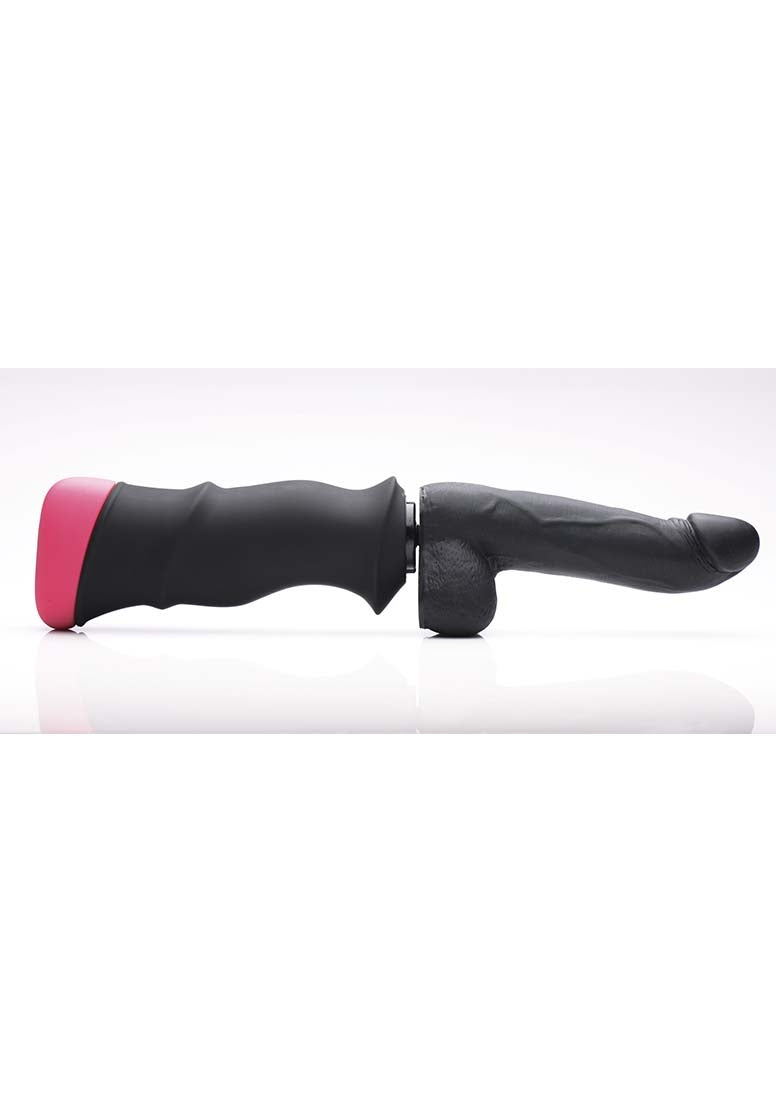 Ervaar ultra-krachtige stootactie met deze hand-held thrusting dildo. Ontdek de 2 intense snelheden van de industriële motor, voor tot 200 stoten per minuut. Beuk jezelf of je partner met de gedefinieerde ribbels en aderen van de realistische dong! Je bent nog nooit zo behandeld... De 6,75 inch dildo-opzetstuk is gemaakt van niet-poreus en ftalaatvrij silicone. Hoewel het niet compatibel is met siliconen glijmiddelen, is het gemakkelijk te reinigen met milde zeep of speelgoedreiniger. Een extra dildo-opzetstuk is inbegrepen dat flexibel is om in de perfecte hoek te buigen om je favoriete delen te raken! Verdere verzorgingsinstructies zijn inbegrepen. Afmetingen: 14 inch in totale lengte. Dildo is 6,75 inch in totale lengte, 5,25 inch in invoerlengte, 1,6 inch op het breedste punt, 1,5 inch in schachtdiameter. Flexibele dildo is 6,1 inch in lengte, 1,4 inch op het breedste punt, 1,2 inch in schachtdiameter. Materiaal: Silicone, ABS kunststof Kleur: Zwart Opmerking: 110-240V US voedingskabel, inclusief een extra flexibele dildo.