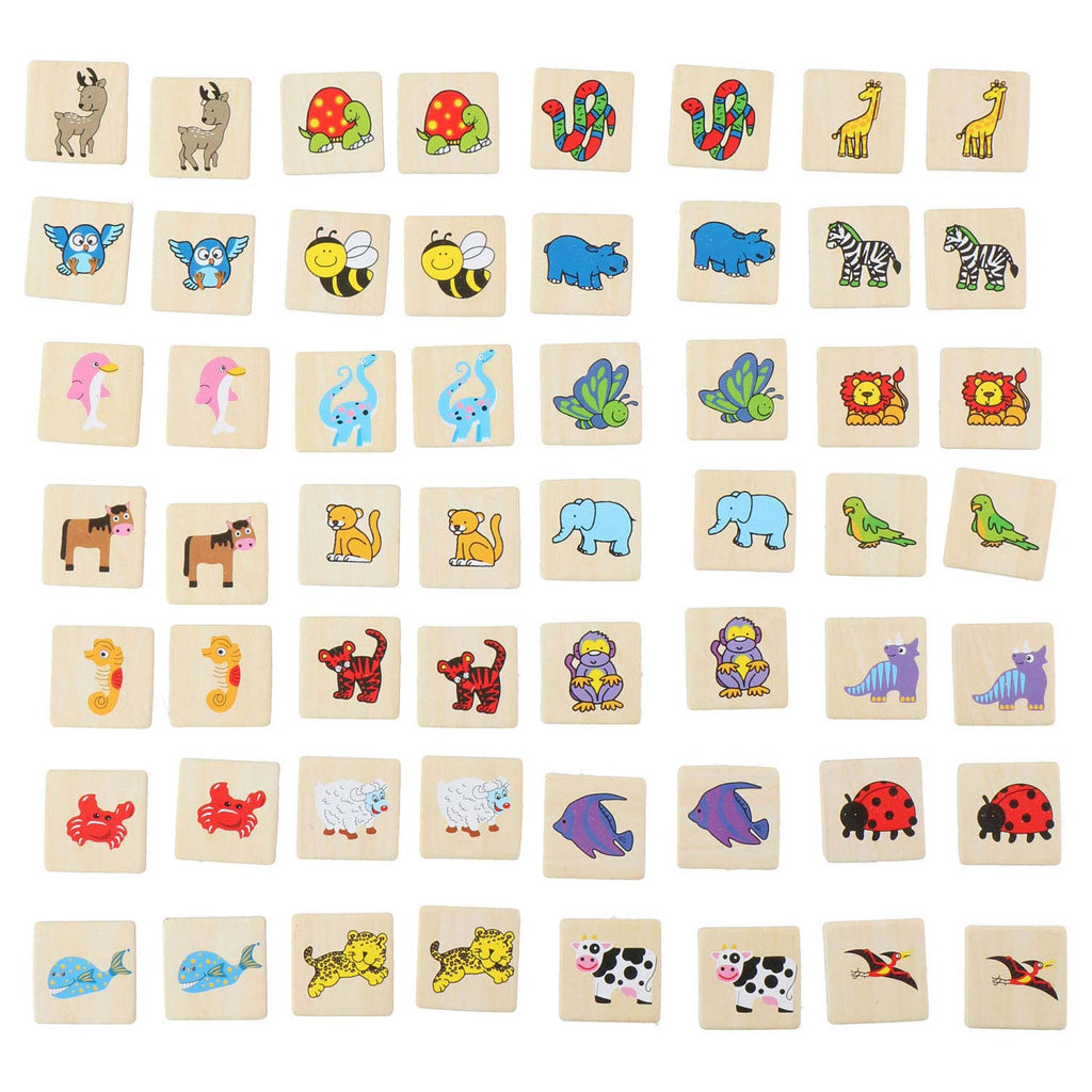 Memoriespel met 56 stuks. Zoek steeds de 2 afgebeelde dieren bij elkaar. Geschikt van 4 tot 6 jaar. De fiches zijn 2,5 bij 2,5 cm.