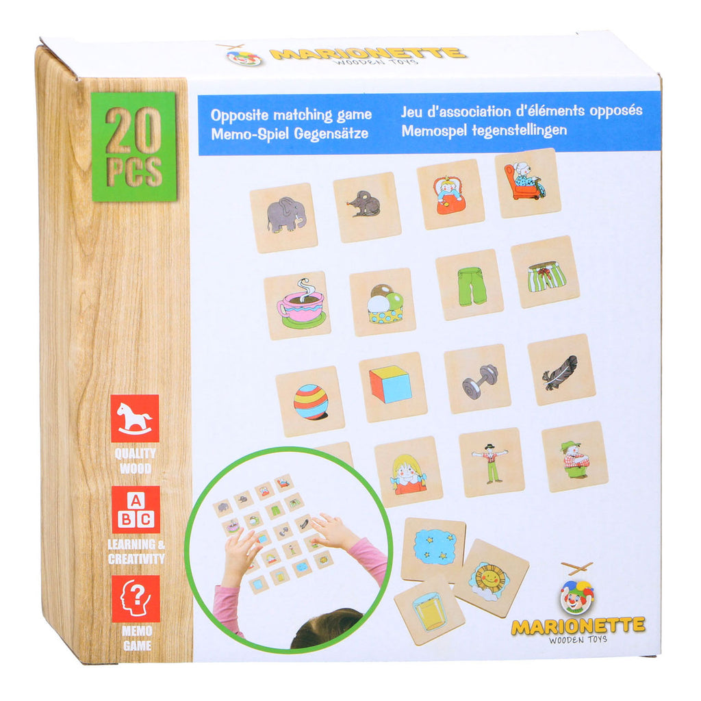 Memospel met 20 houten fiches. Zoek de tegenstellingen bij elkaar. Fiches zijn 3 bij 3 cm. Geschikt van 4 tot 6 jaar.