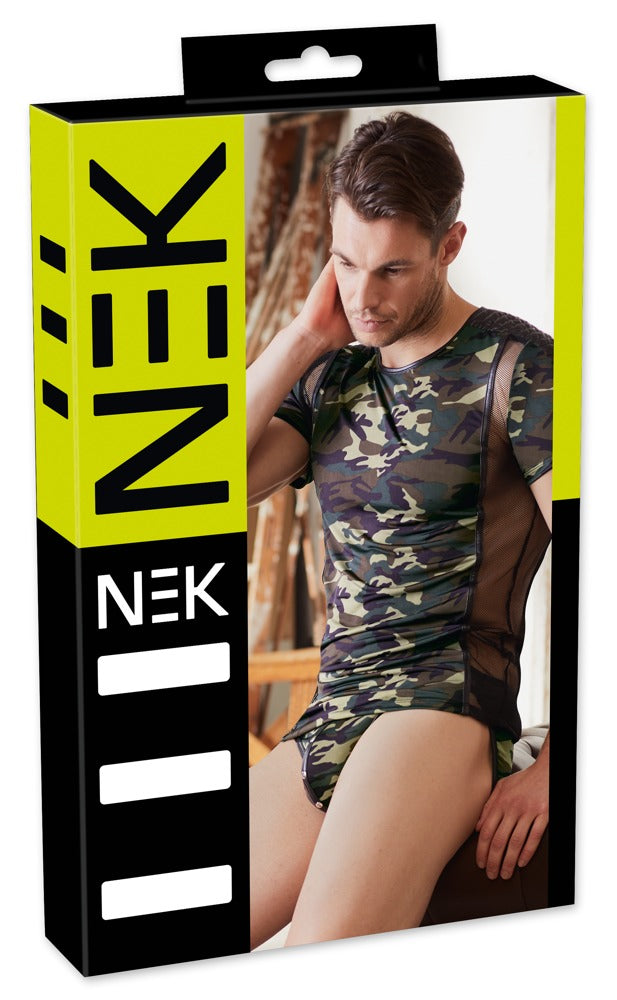 A soft microfibre shirt with a camouflage print and a net insert at either side. There are stitched pieces of beautiful black matte material on the shoulders and the sleeves.
