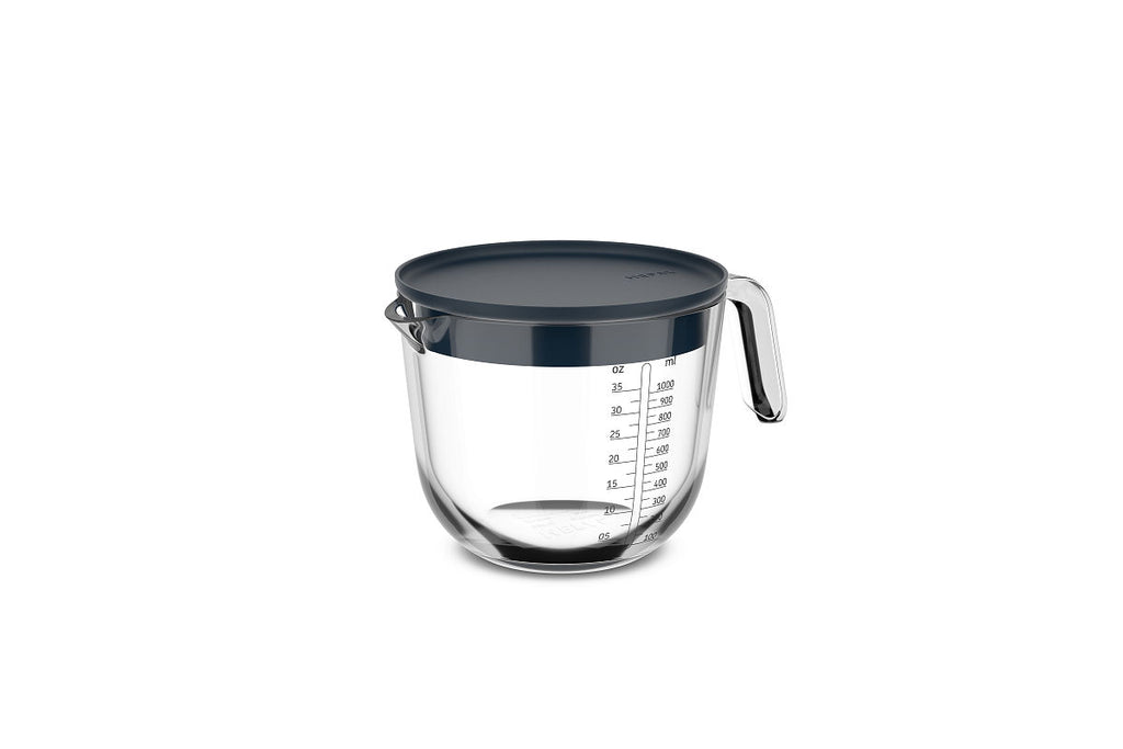 De maatbeker met deksel is ideaal voor nauwkeurig afmeten van vloeistoffen en ingrediënten. Gemaakt van hittebestendig glas.